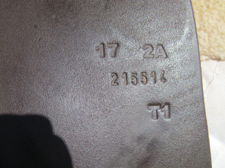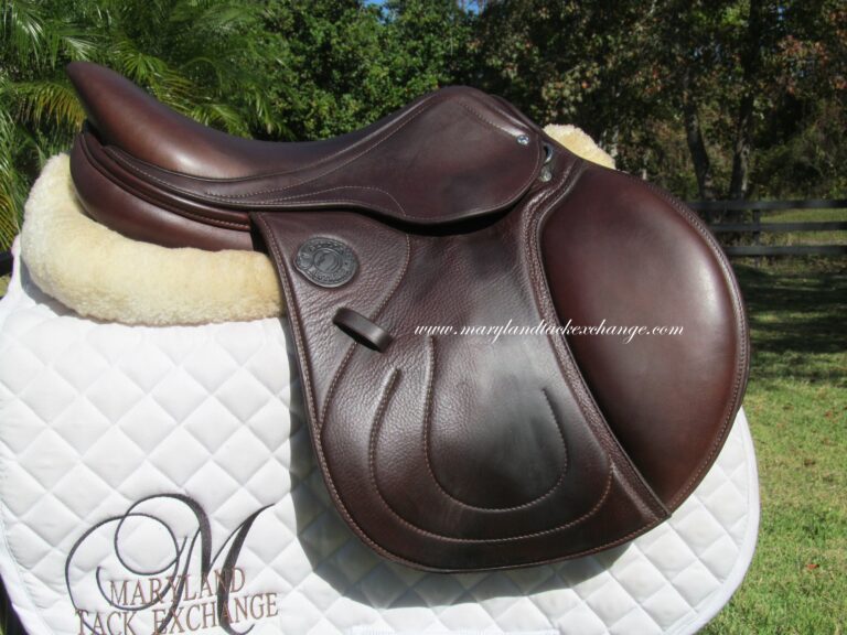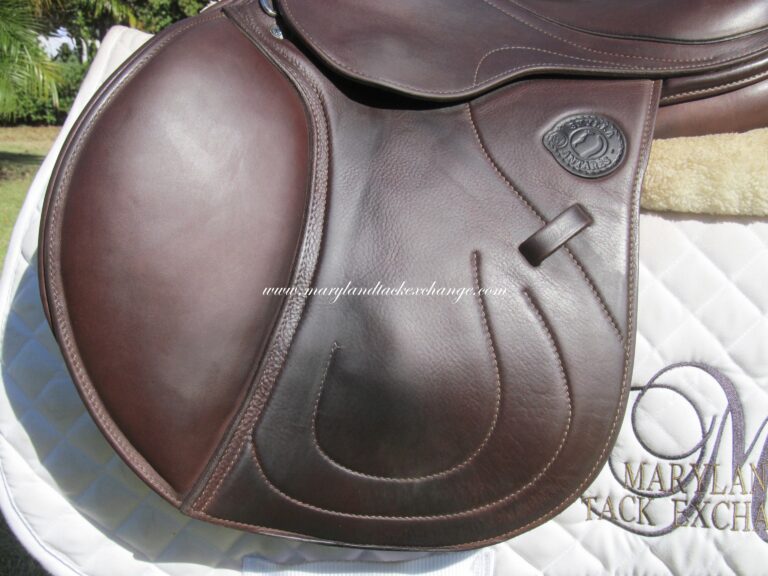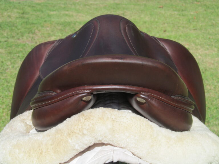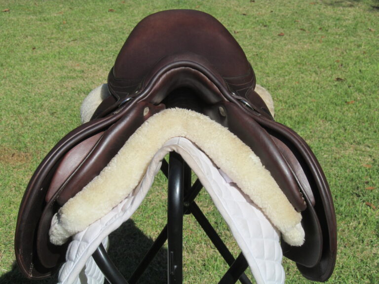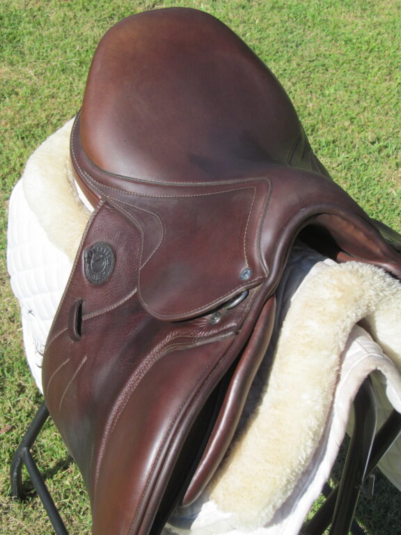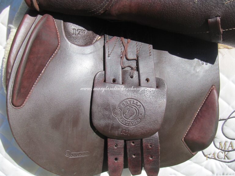 Seat is stamped 17″ but measures just over 16.5″ flaps measure 13.5″ bar to bottom and 13.5″ across (#2A forward flaps) the front gullet measures 5 1/4″ wide tree.