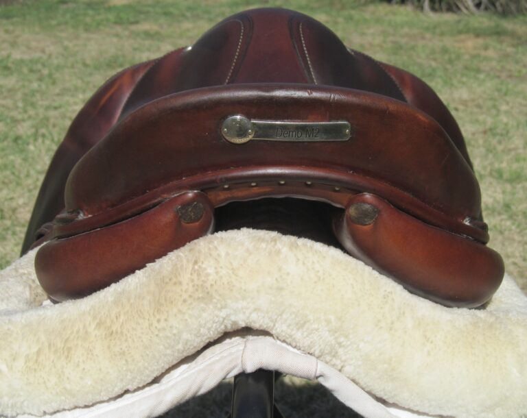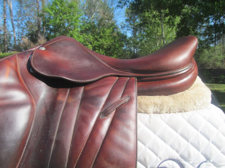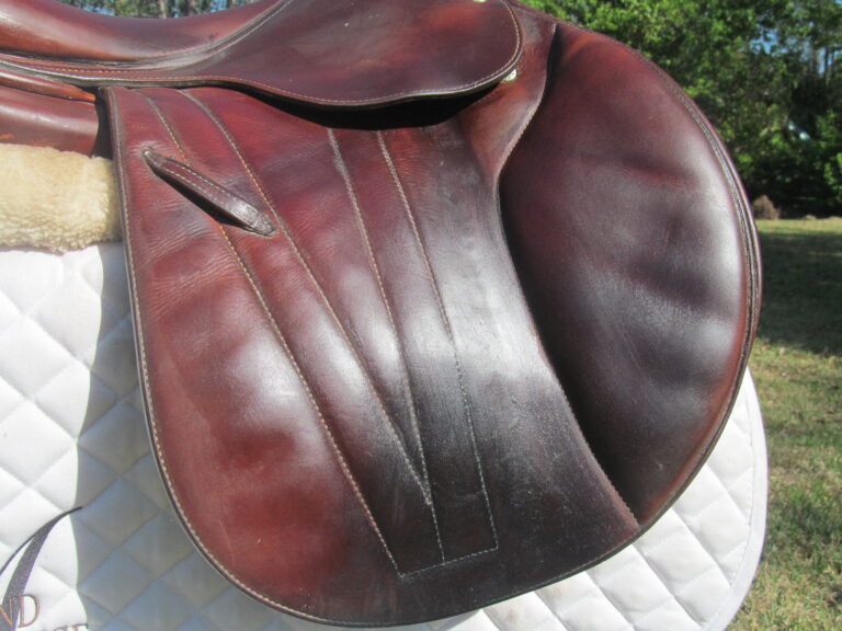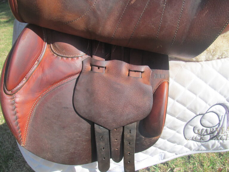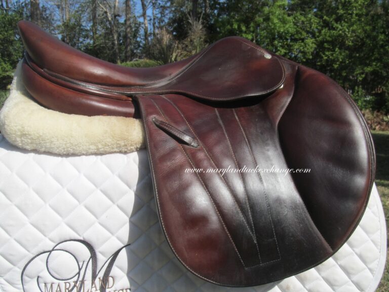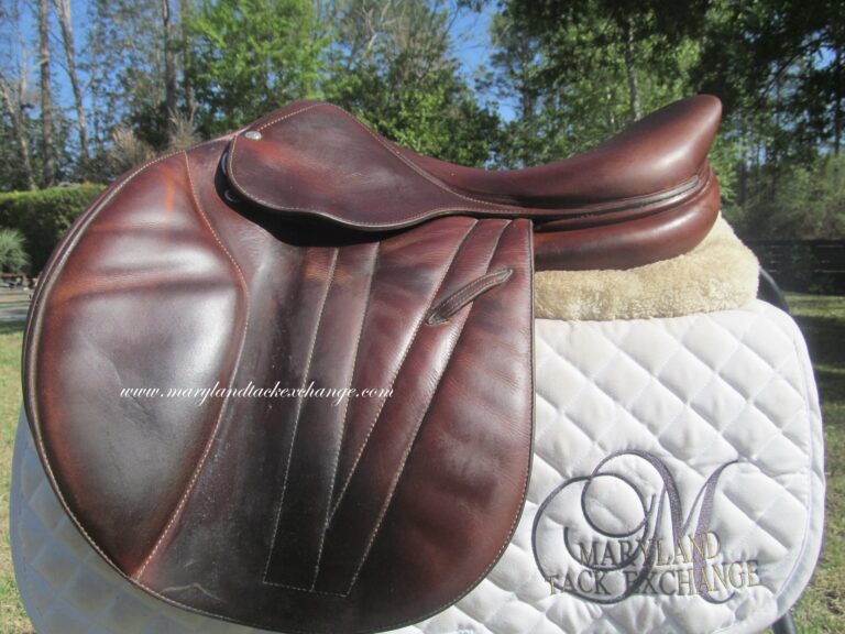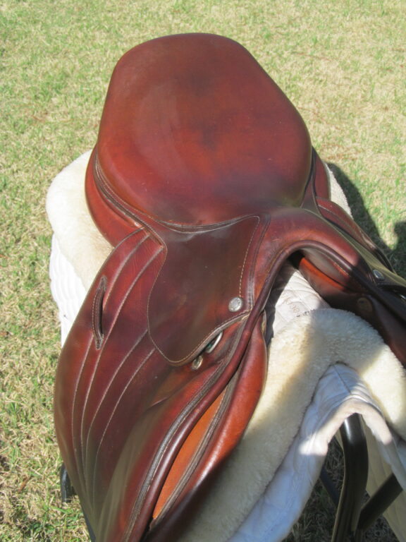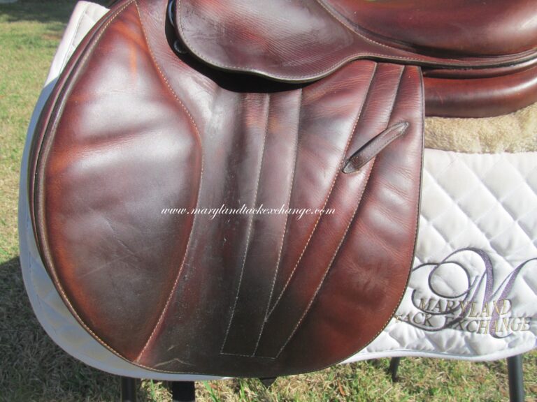 2016 model. The leather is buttery soft made of the upgraded premium leather. This has the M seat which is the medium depth seat and quite hard to find used. There are no tears and no loose stitching. Saddle shows basic use you would expect with soft leather. There is a name plate that you can cover up with your own. This has the upgraded $500 integrated panels that provide a closer contact feel between rider leg and horse. Front and back blocks under the flaps.
