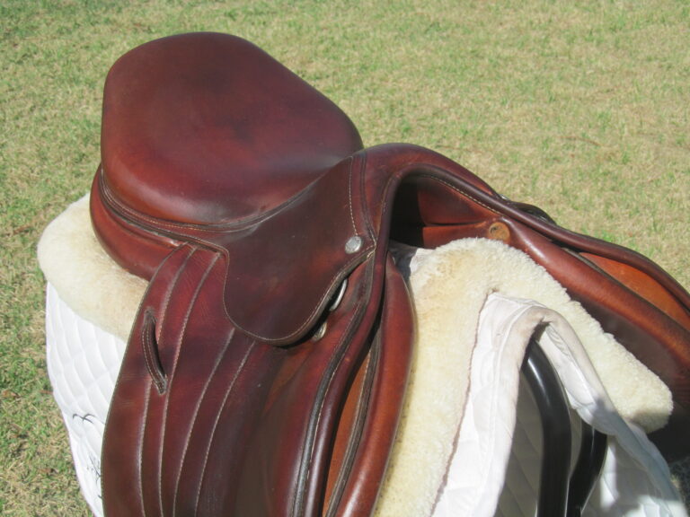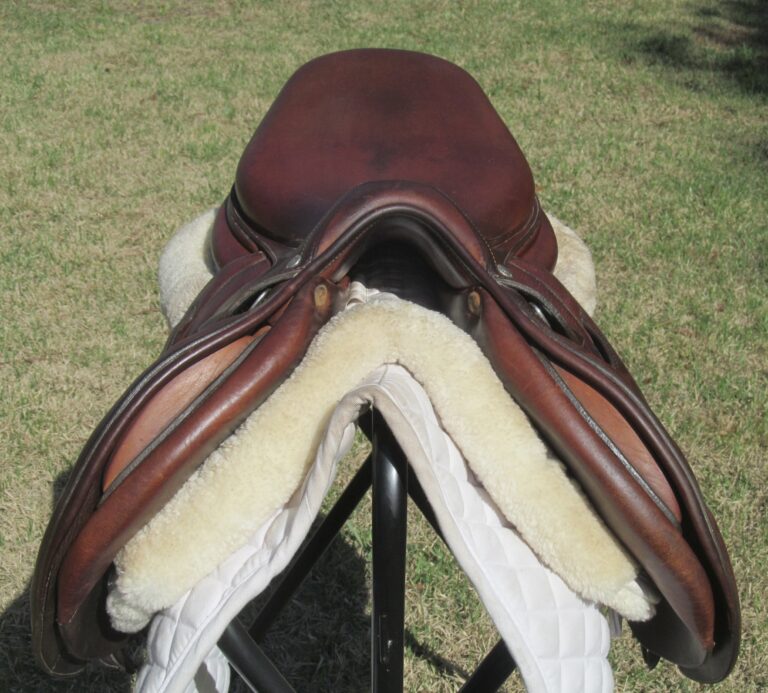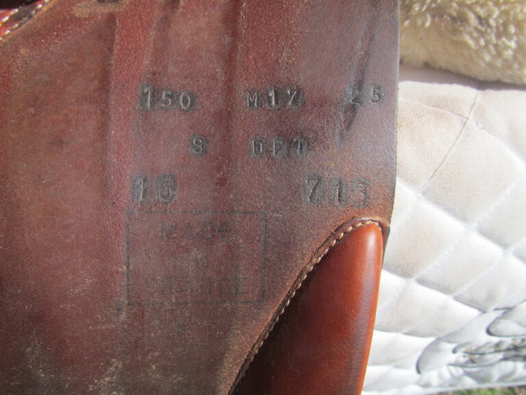 Seat is stamped 17″ but like most Butets measures 17.5″ flaps measure 12.5″ bar to bottom and 13″ across (#1.50 short/ forward flaps) the front gullet measures 4 1/4″-medium tree.