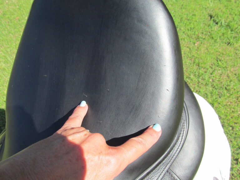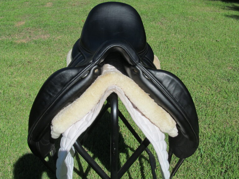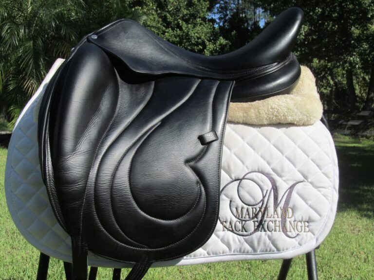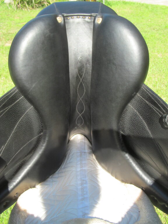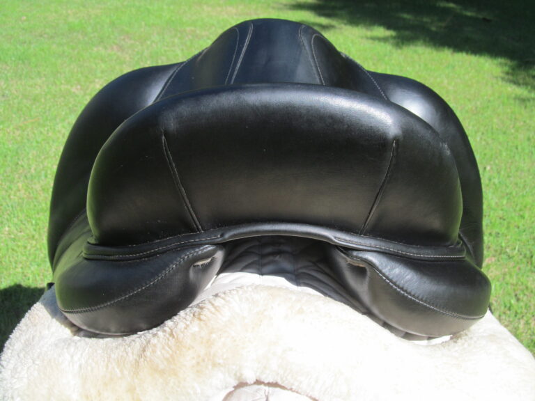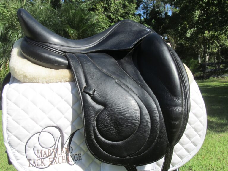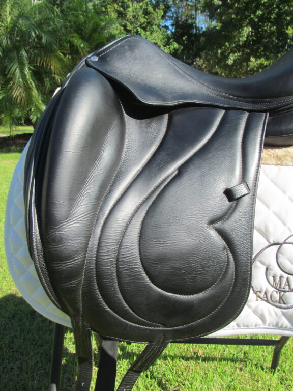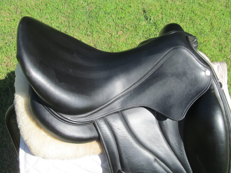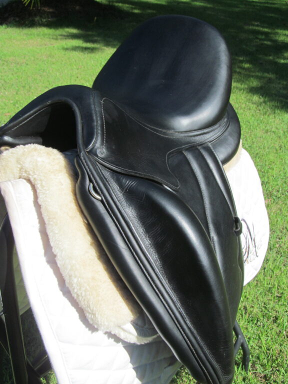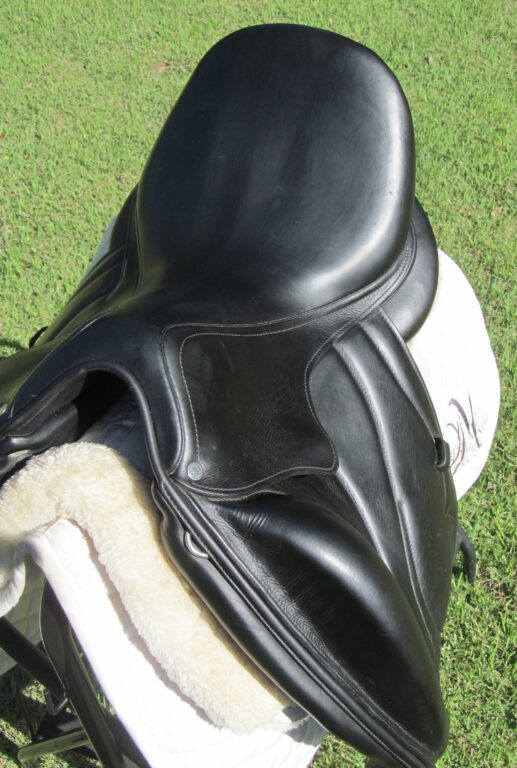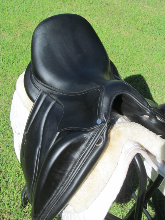2014 Model! Monoflap in design so it is a true close contact dressage saddle. Deep seat and large exposed outer blocks really help keep you in place correctly. There are no tears, no loose stitching, no cracking and no fading anywhere at all. Saddle is jet black in color. There are a few light cat claw marks to seat (see picture). They are minimal but we always disclose everything. There was never even a name plate added. Calfskin leather is very “grippy” and soft so that you stick to the saddle. Priced to sell!