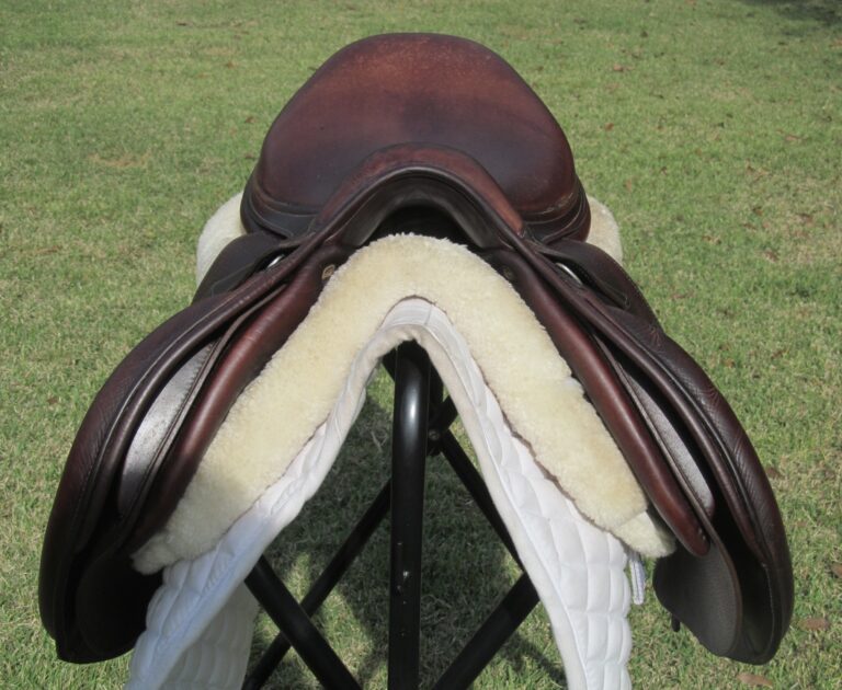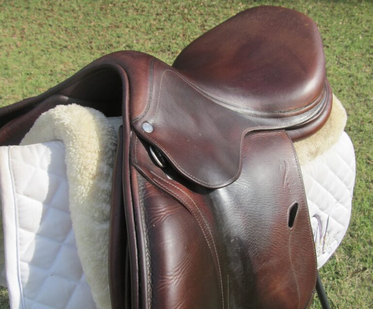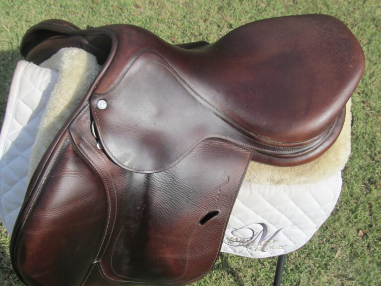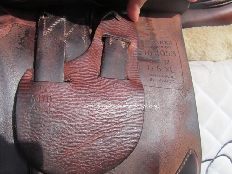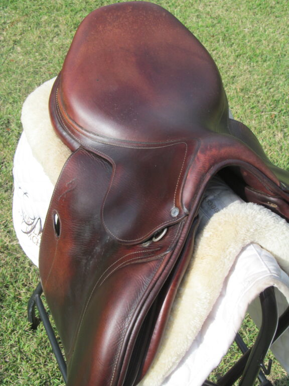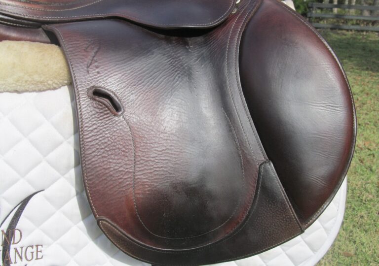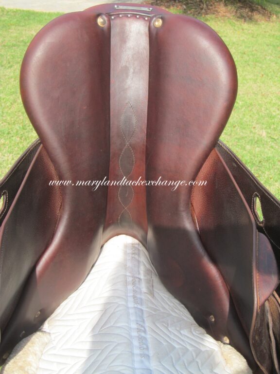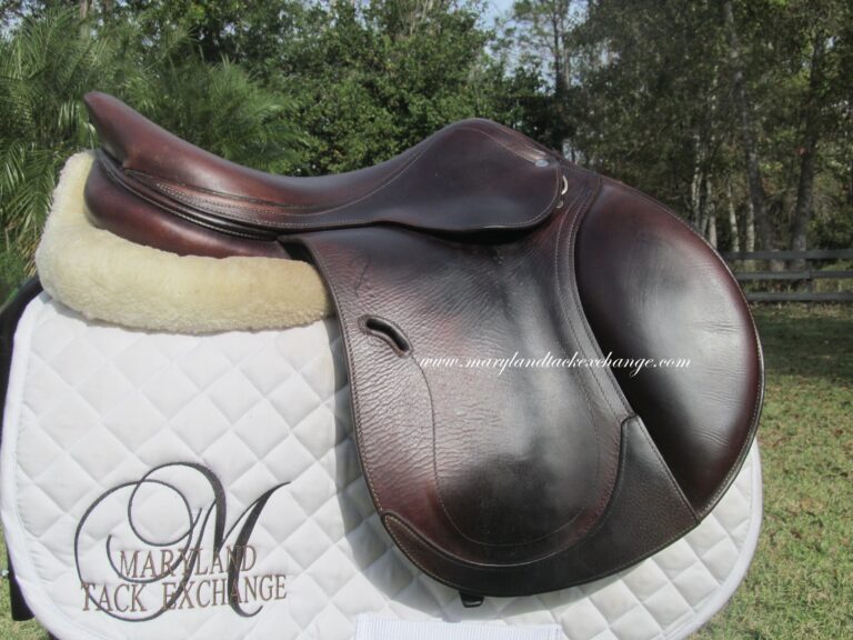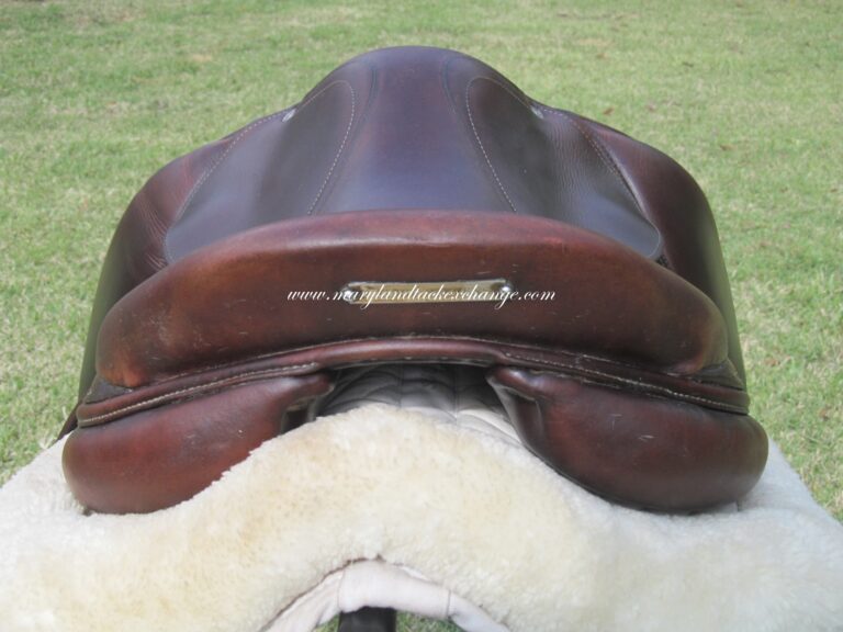 2018 Model. Dark brown in color with the upgraded calfskin leather. The leather is very grippy and you will not slip and slide around. There are no tears, no cracking and no loose stitching. The seat does show some discoloration marks and has been discounted due a few hundred $$ due to this. This has a name plate you can cover up with your own. Outer pads are thick and soft and your knees will sink into them. Front blocks and back blocks under the flaps. This has a very RARE Wide A01 tree. Great for horses that have minimal wither and are round. This 2018 is priced to sell!