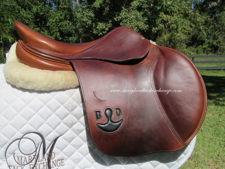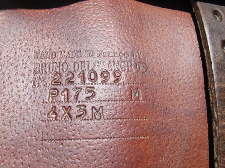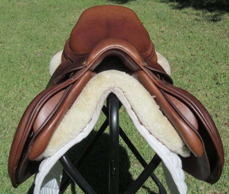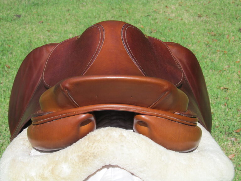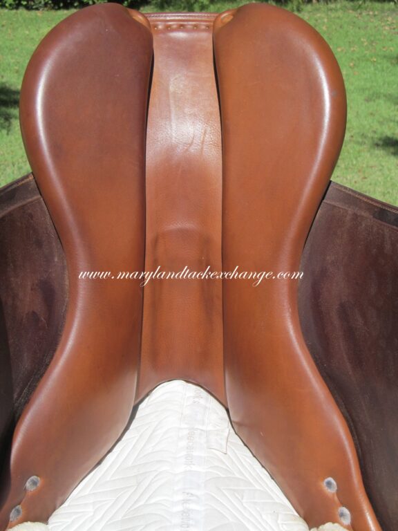 Seat is stamped 17.5″ flaps measure 13.5″ bar to bottom and 14″ across (4X forward flaps) the front gullet measures 4 3/4″- medium tree.