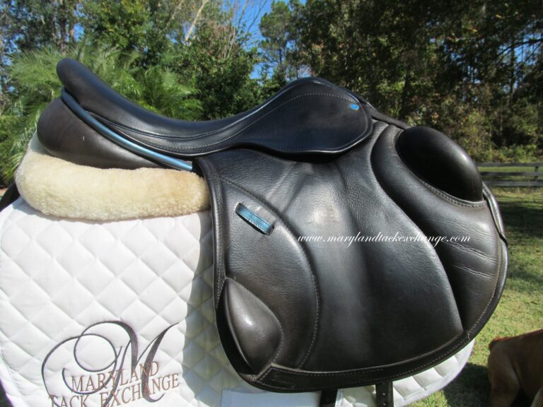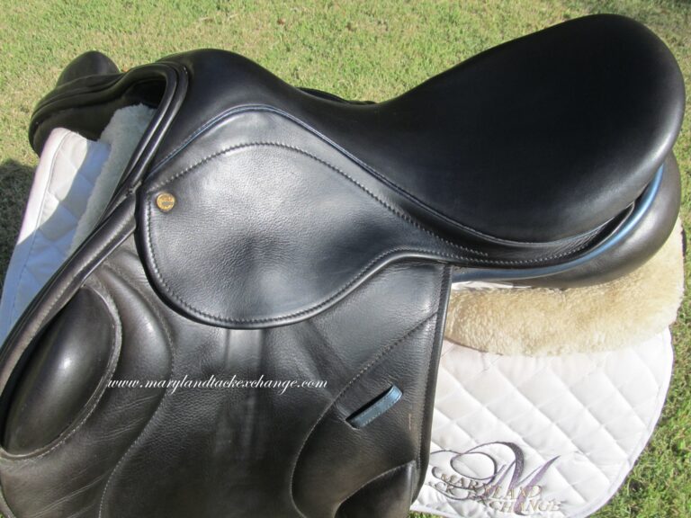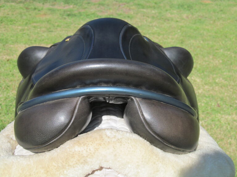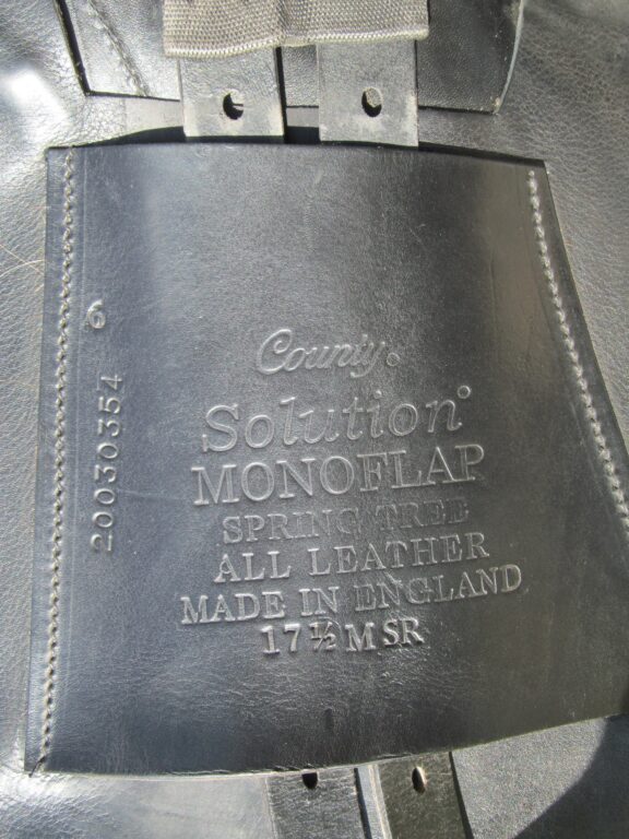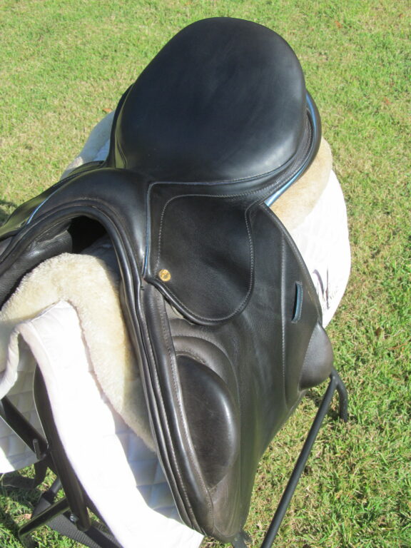 Seat measures 17.5″ flaps measure 13.5″ bar to bottom and 14″ across, the front gullet measures 4 1/2″-medium tree.