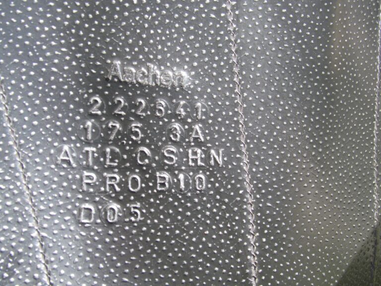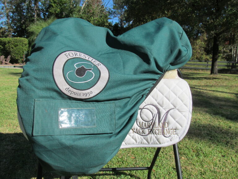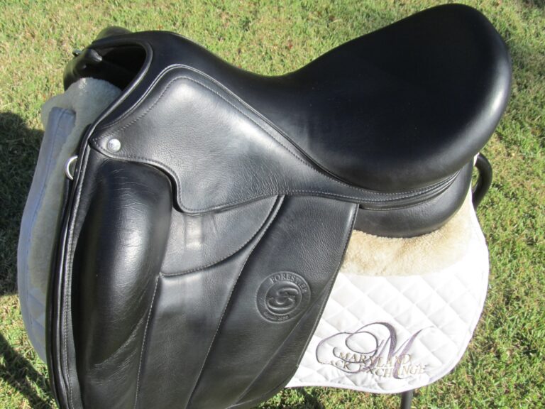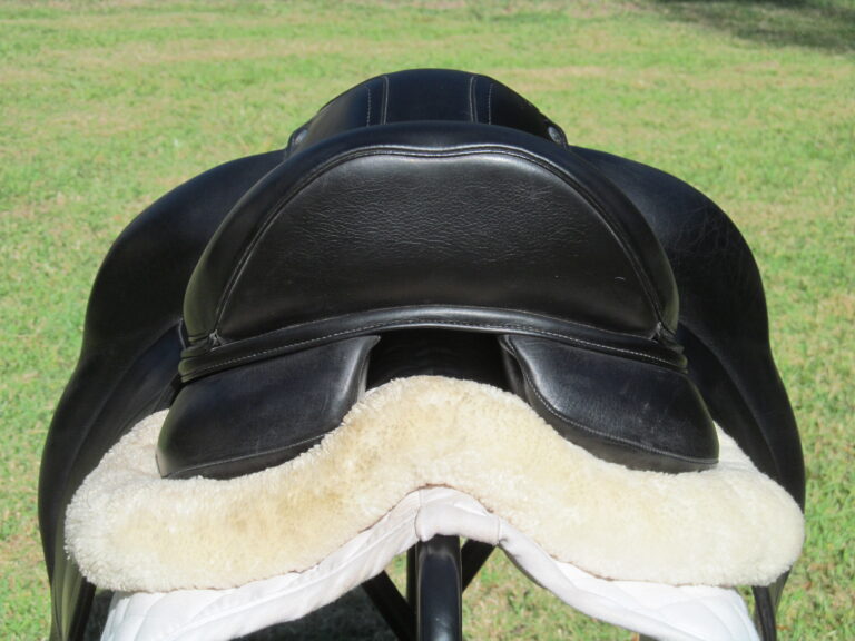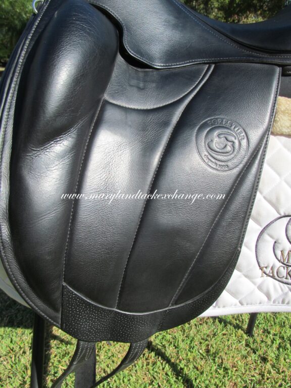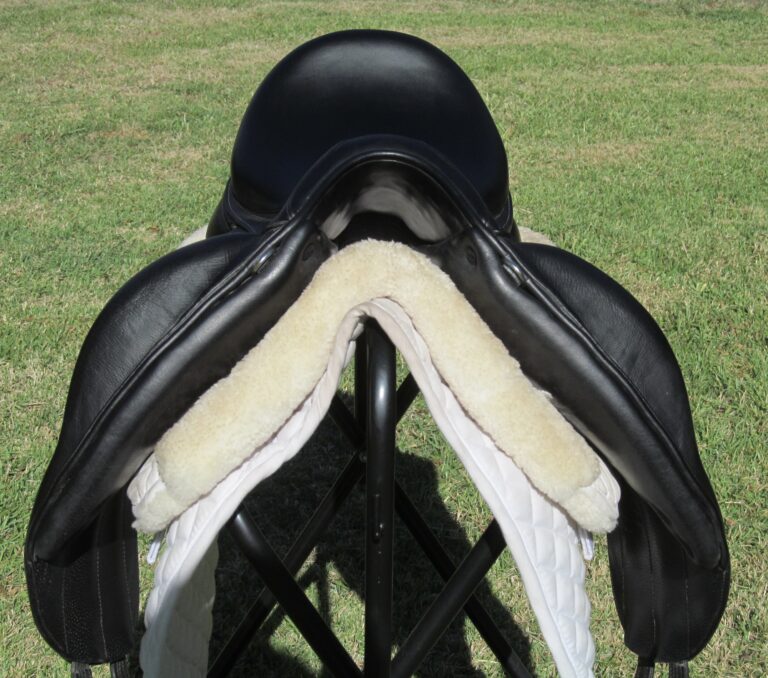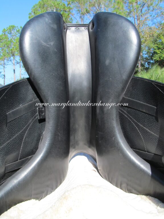 Seat stamped 17.5″, flaps measure 16 1/4″ bar to bottom (#3A flaps) and the front gullet measures 5″- medium/wide tree.