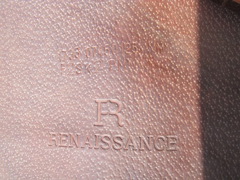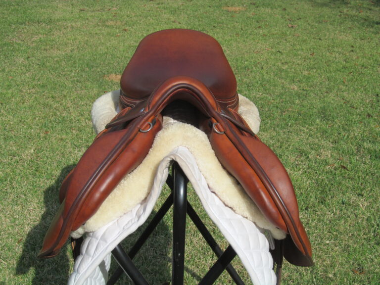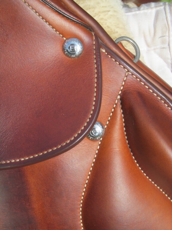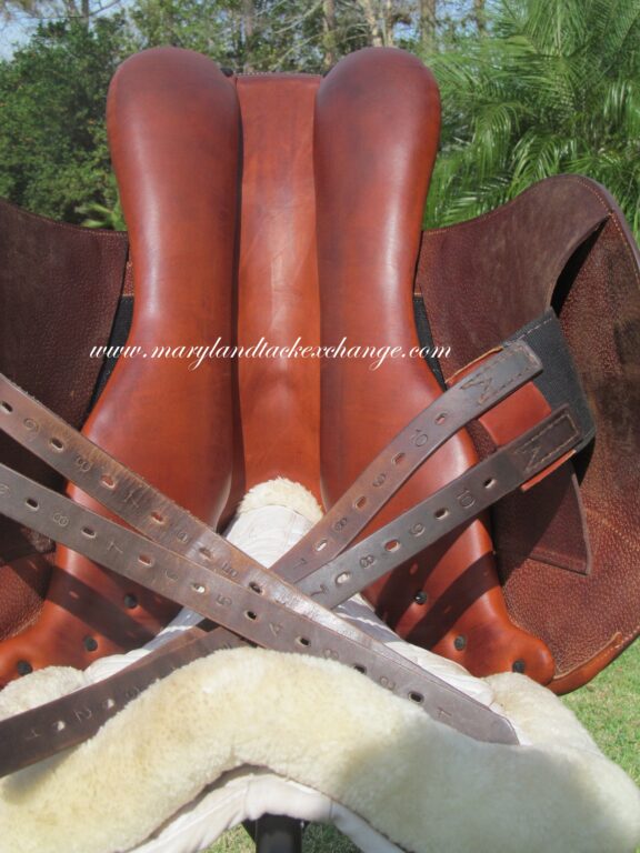 Seat is stamped 17″ but Prestige only stamps in whole sizes so it measures 17.5″ flaps measure 13.5″ bar to bottom and 14″ across the front gullet measures 4 1/2″- (33 CM medium tree).
