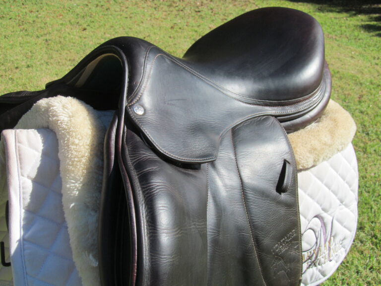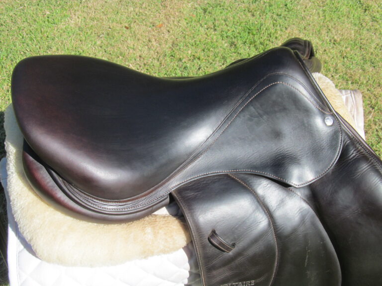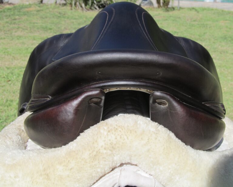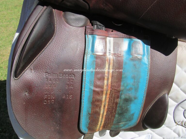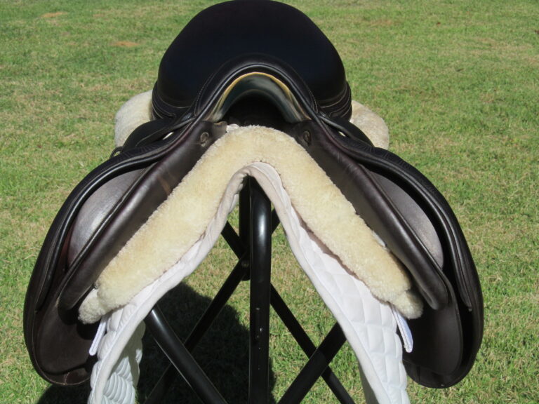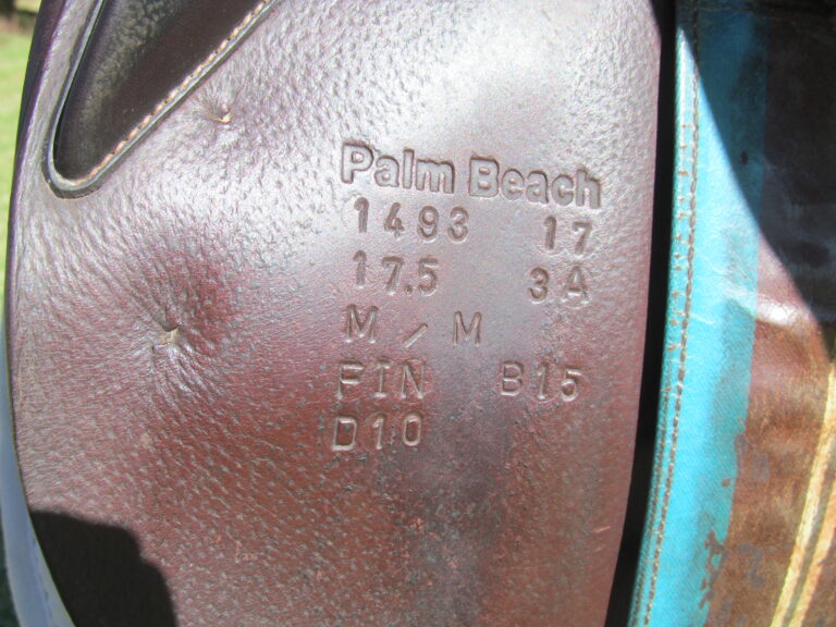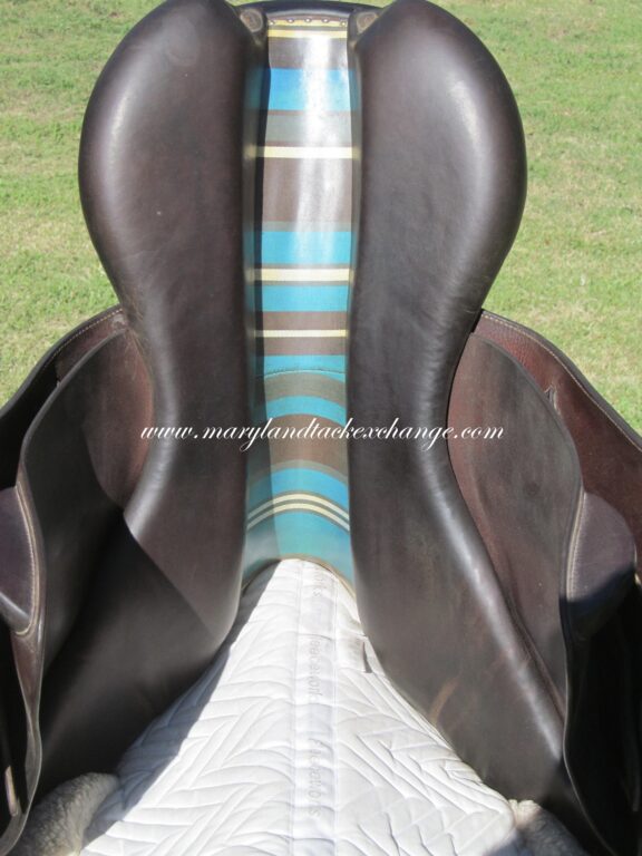 Seat is stamped 17.5″, flaps measure 14″ bar to bottom and 13 1/4″ across (3A extra forward flaps) the front gullet measures 4 3/4″-medium tree.