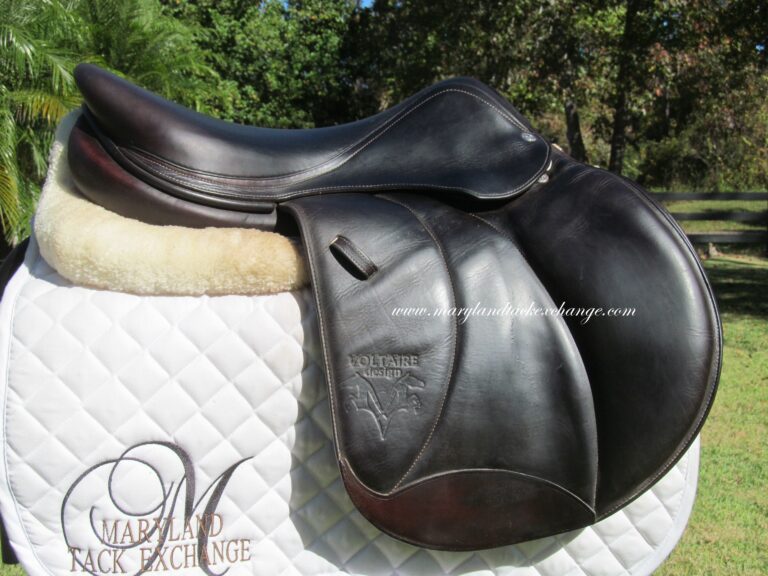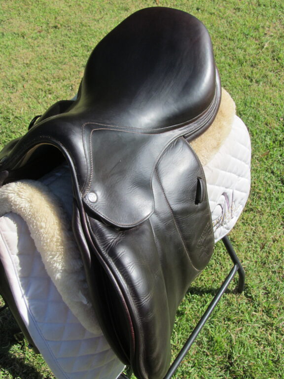 2017 model! FIN Panels (good for horses with wider shoulders). Dark chocolate brown in color with upgraded calfskin leather. Saddle is in nice condition with no tears and no loose stitching. There was a name plate removed that you can cover up with your own. The leather is butter soft and not slippery. Front + back blocks under the flaps.