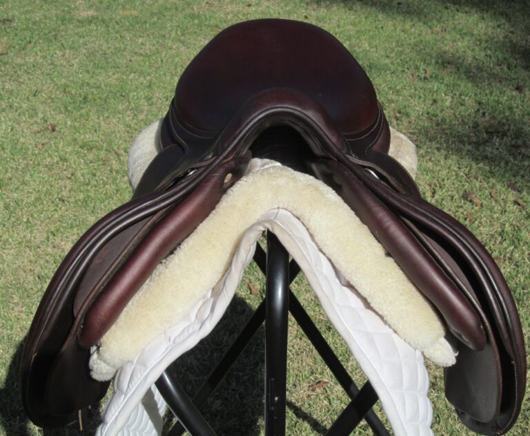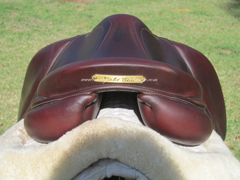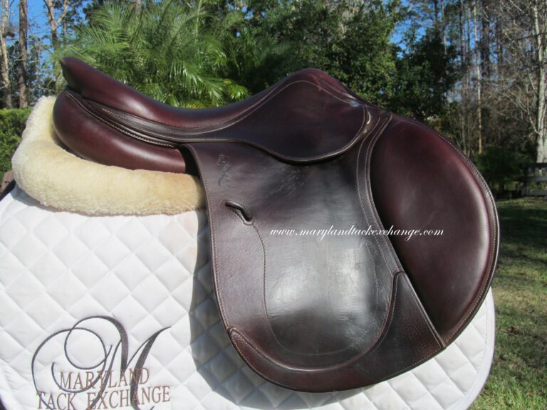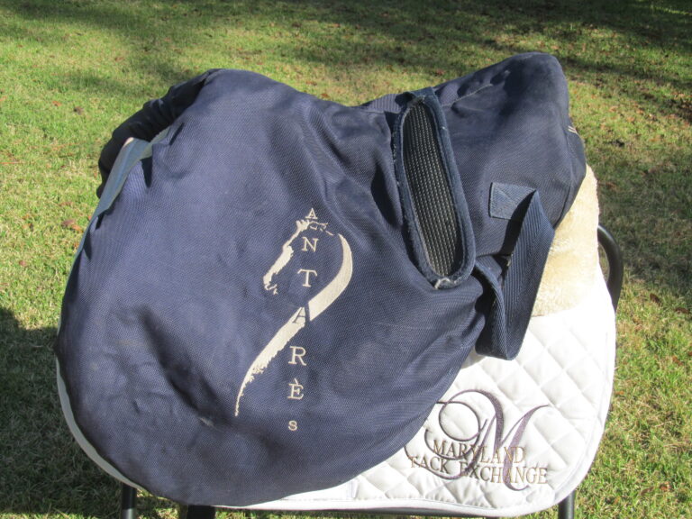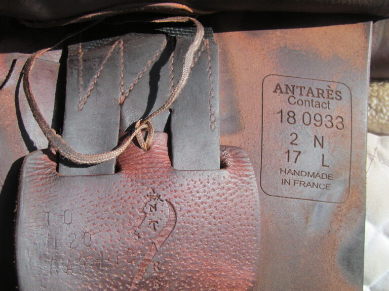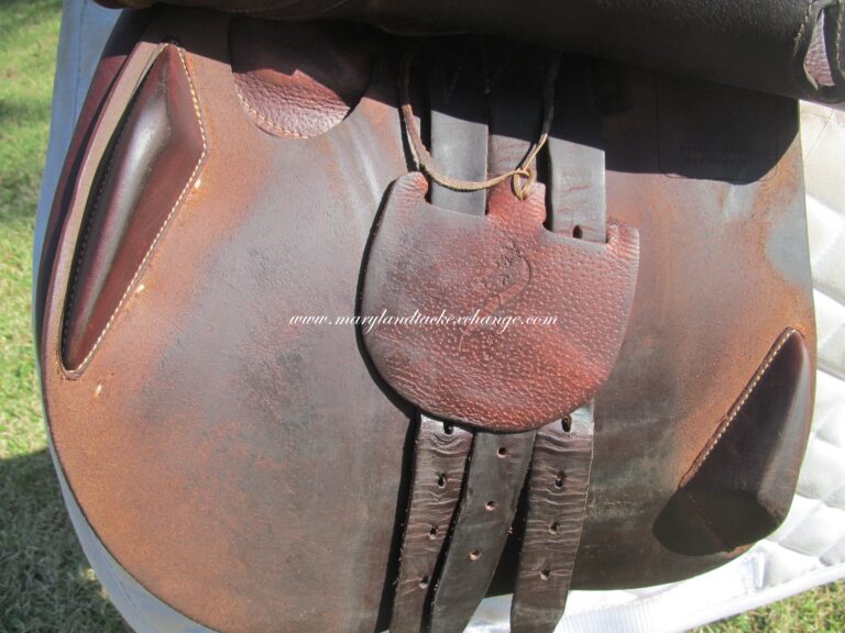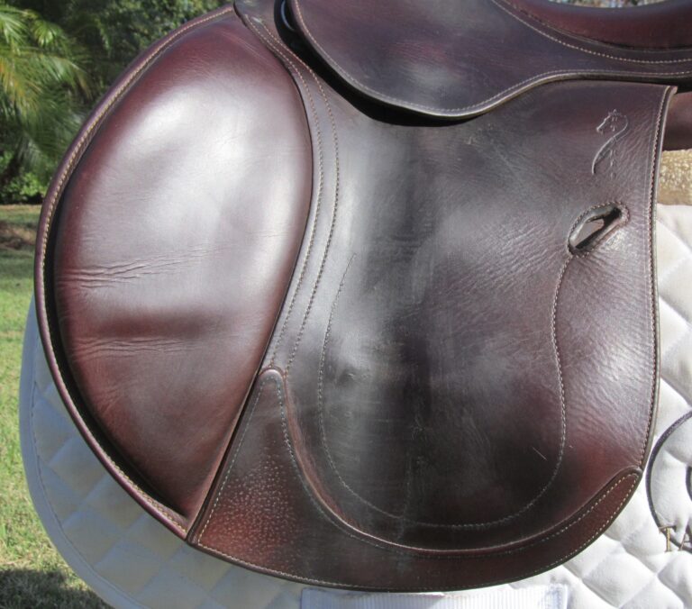 2018 Model. Upgraded calfskin leather that is very grippy and soft ($800 upgrade). You can just about roll the flaps. There are no tears and no loose stitching. Had a name plate added you can cover with your own. The bottom left panel when you flip the saddle upside down has a 2″ scratch (see picture). Outer pads are nice, soft and thick and your knees will sink into them. Front blocks and back blocks under the flaps. Save yourself a about 60% of the cost of a new one.
