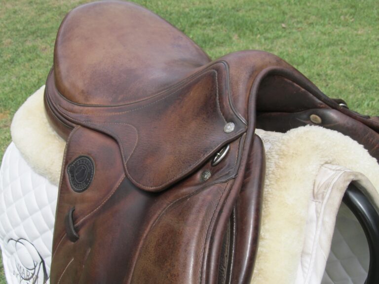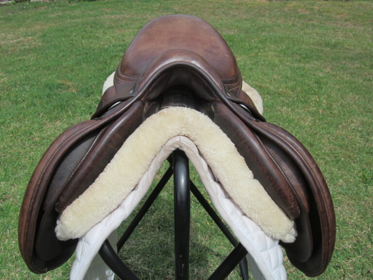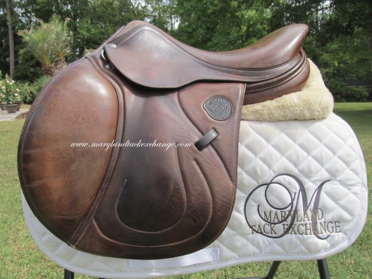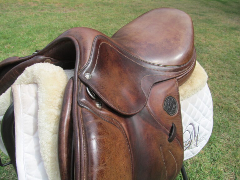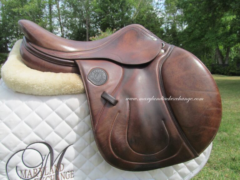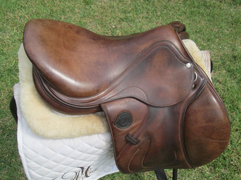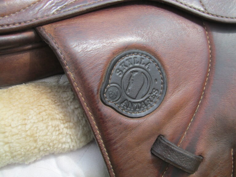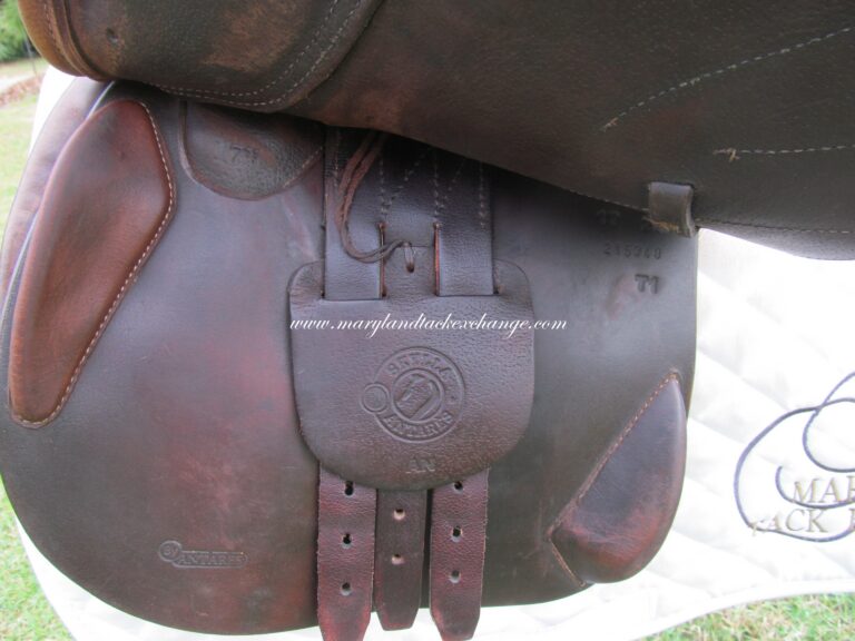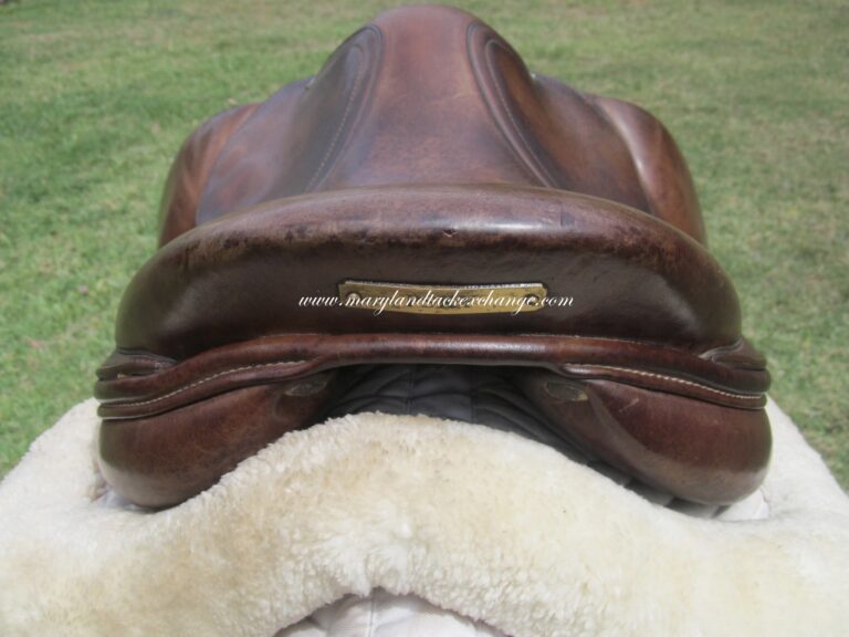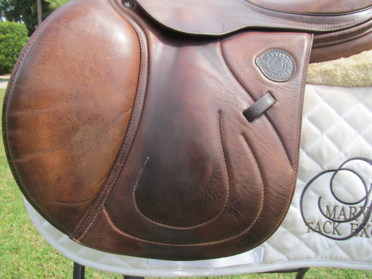 2021 Model. Upgraded calfskin leather. This saddle has nice soft grippy leather. Medium brown in color. There are no tears and no loose stitching but this saddle does show discoloration and spotting on the seat and outer pads. We took lots of pictures for you to see everything. There is also a small nick up by the cantle and some rubs on the bottom of large flaps from boots (see pictures). Due to the flaws this saddle is being offered at $1200 below normal resale value. Great change to grab a French brand saddle that is a newer model and will not break the bank!
