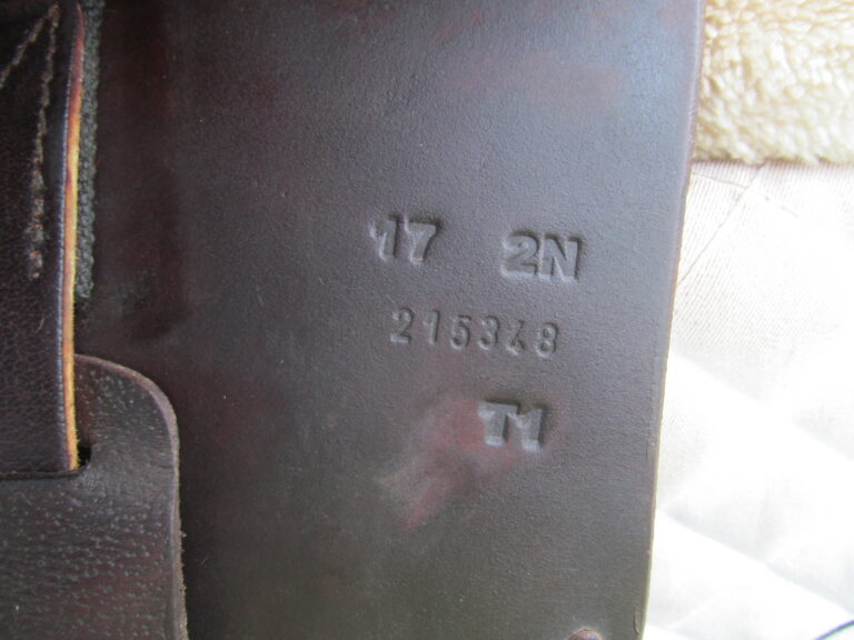 Seat is stamped 17″ flaps measure 13.5″ bar to bottom and 13.5″ across (#2N standard flaps) the front gullet measures 4 1/2″ medium tree.
