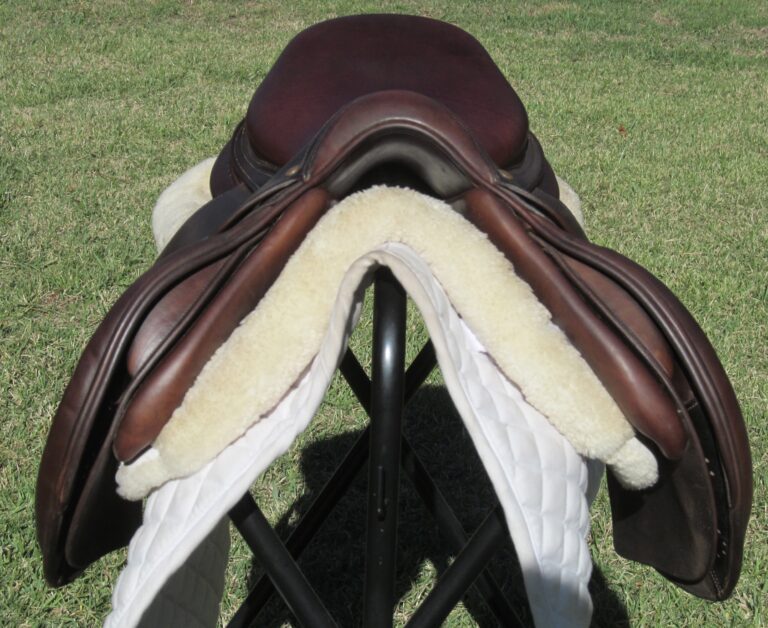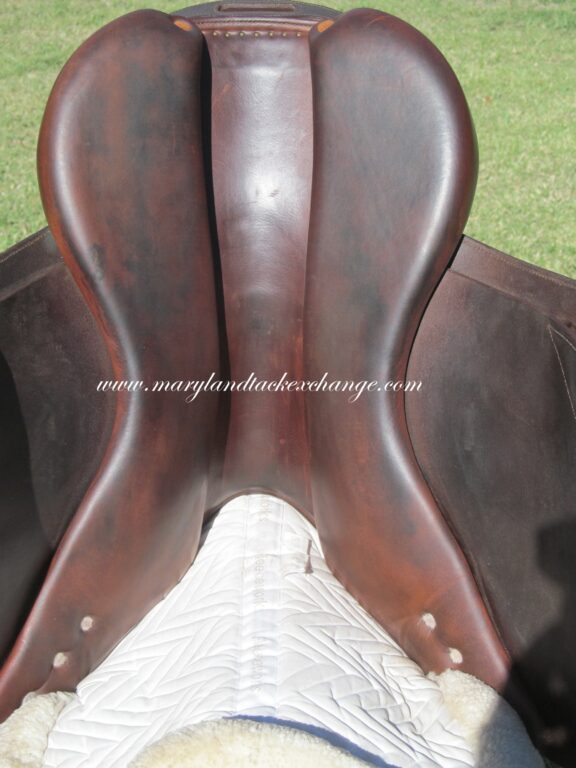 Seat is stamped 17″ flaps measure 13″ bar to bottom and 13″ across (4A forward flaps) the front gullet measures 4 1/2″-medium tree.