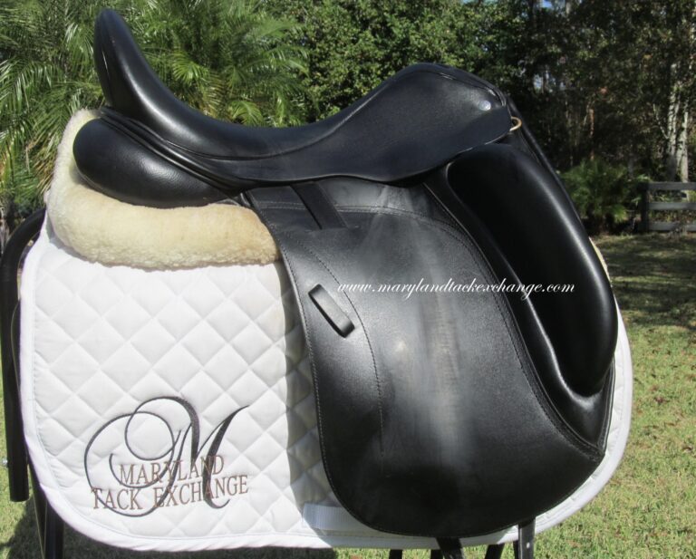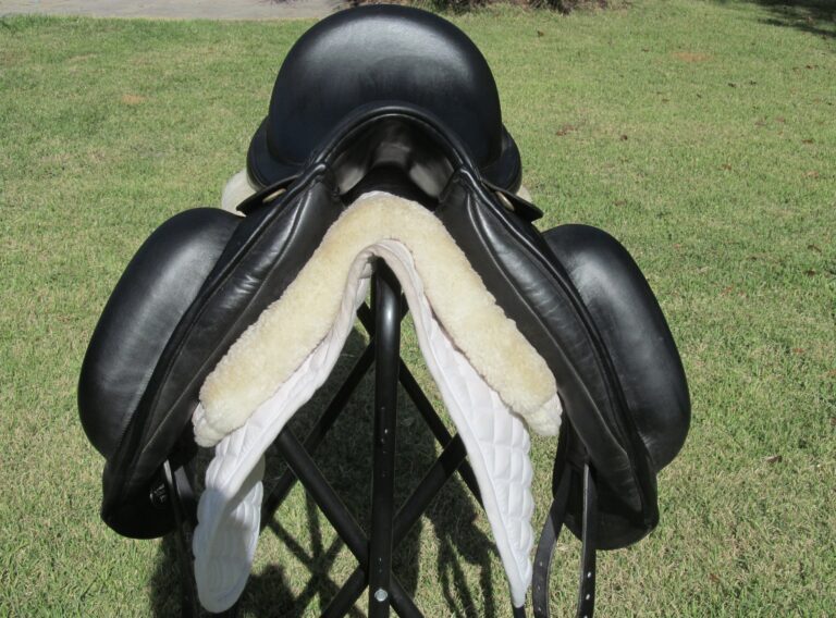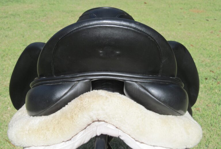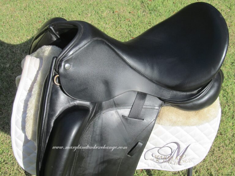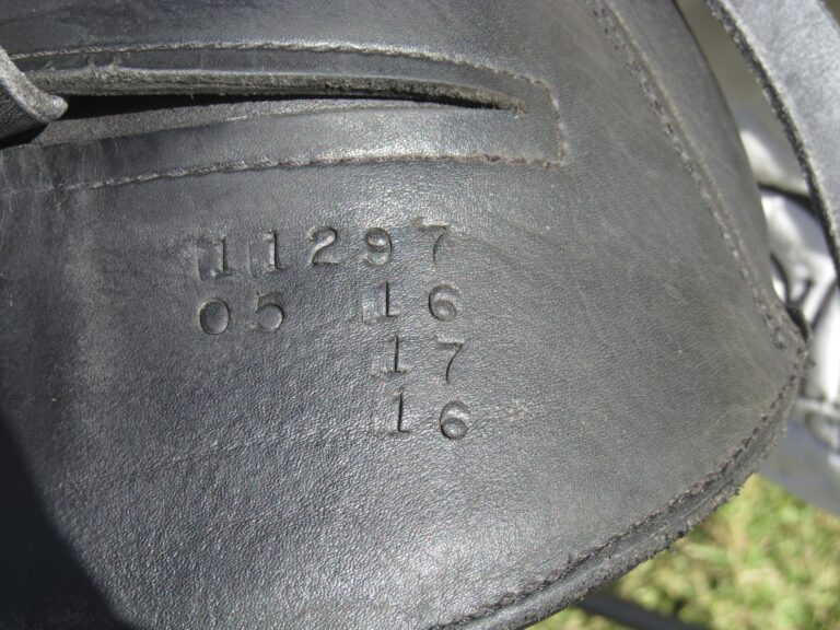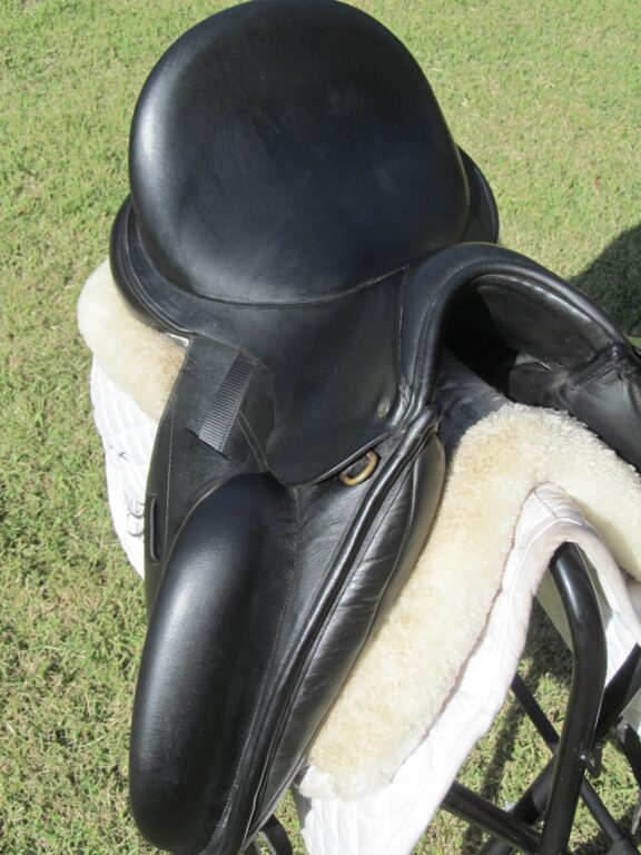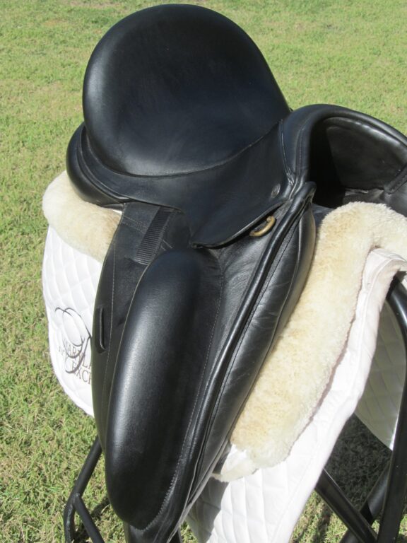 Seat is a 17″ flaps measure 16.5″ bar to bottom and the front gullet measures 5″-medium/wide tree (adjustable).