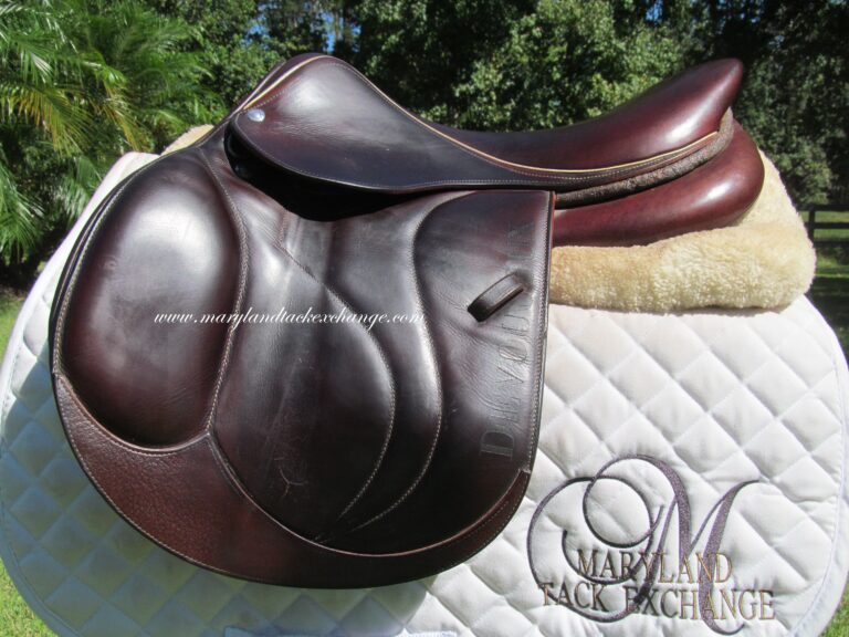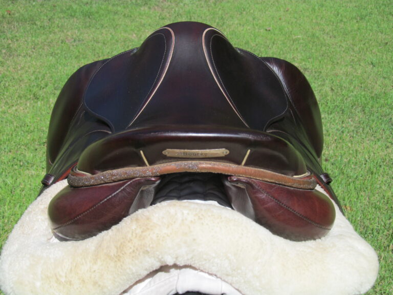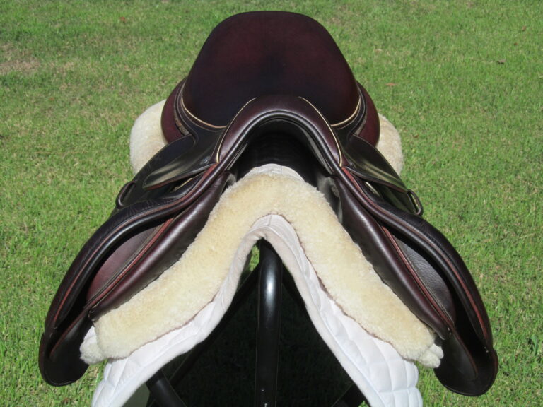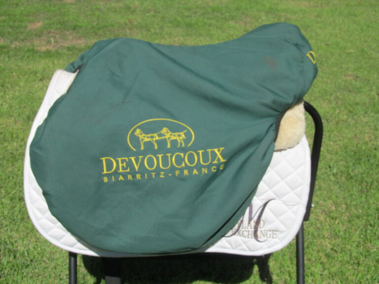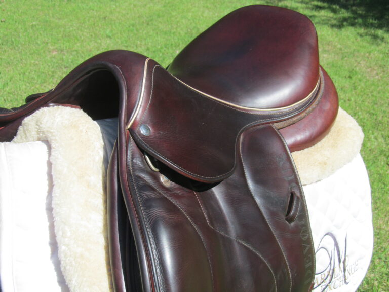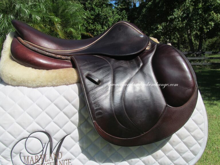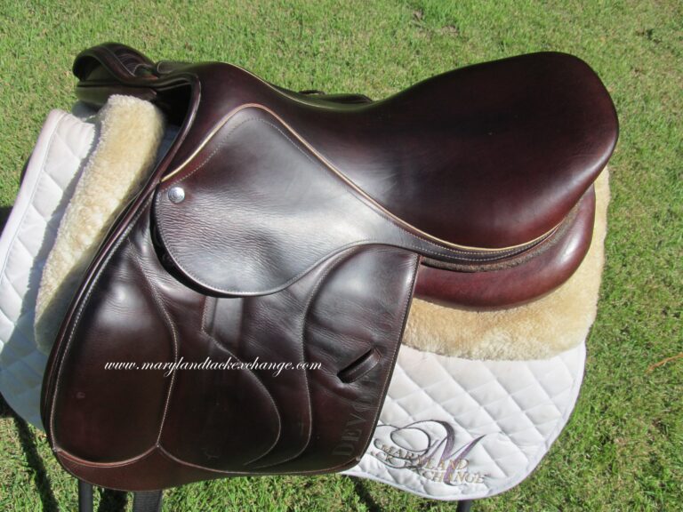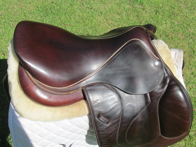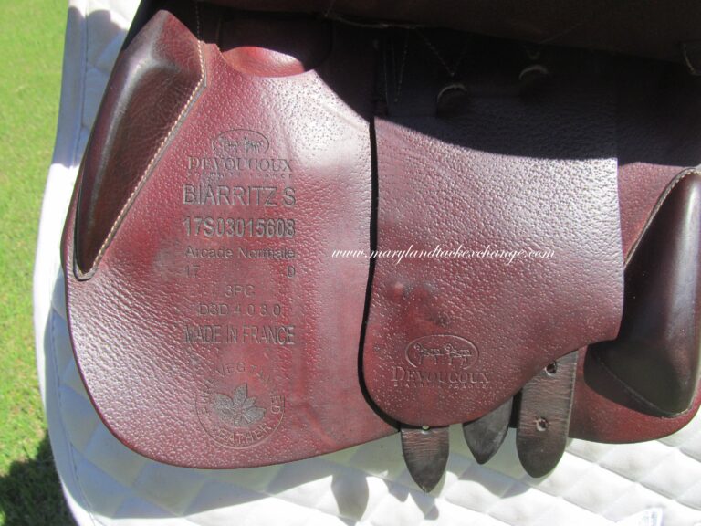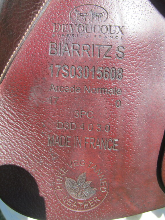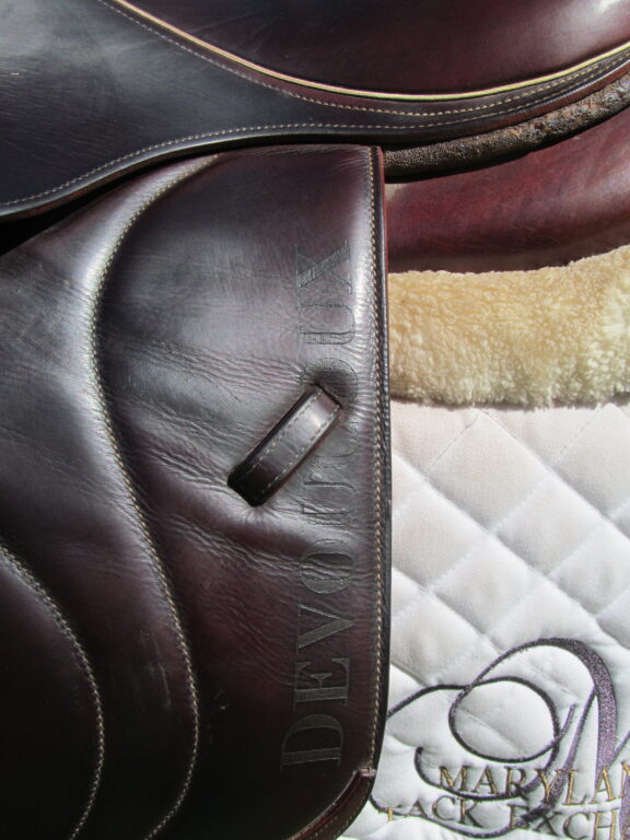 2017 MODEL! Saddle is in nice condition. Deep reddish brown in color. Upgraded calfskin leather ($800 value) makes for a nice “grippy” ride. You will not slip and slide around in this one. There are no tears but you can see the crystals along the seat are coming off. This is something that can stay as is or you can have Devoucoux change the piping out to new crystals or a different color. Due to this the saddle has been discounted $600 so owner can have this taken care of how they would like. Front + back blocks under the flaps. If you have been looking for a O flap they are near impossible to find unless on a child size flap. This is a custom made saddle and a unicorn of a find for the short leg rider needing the adult size seat!