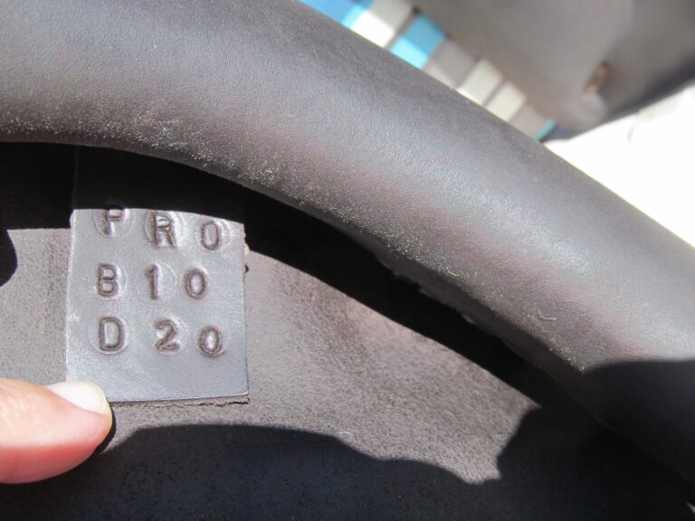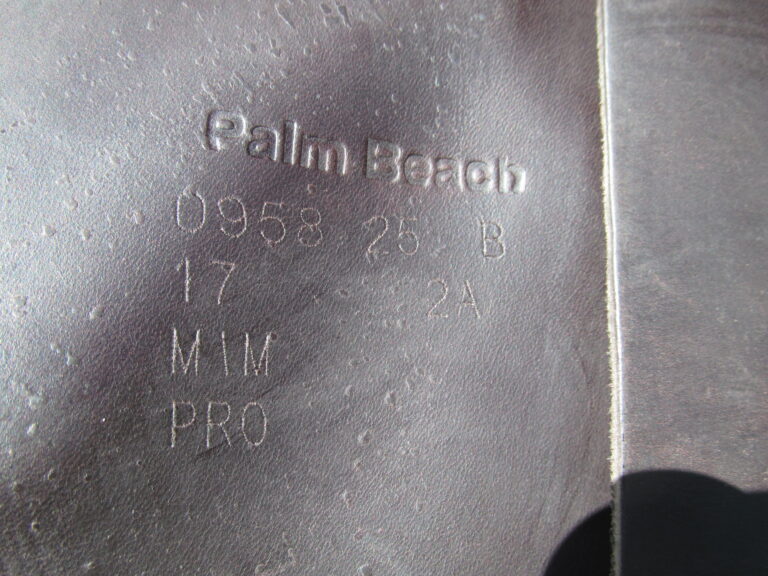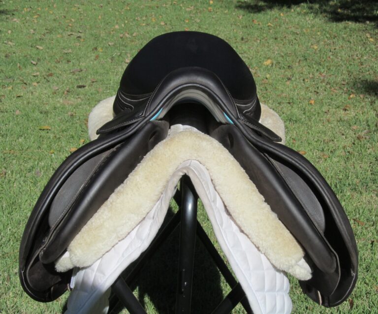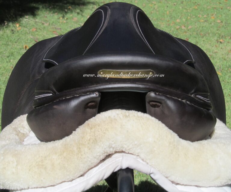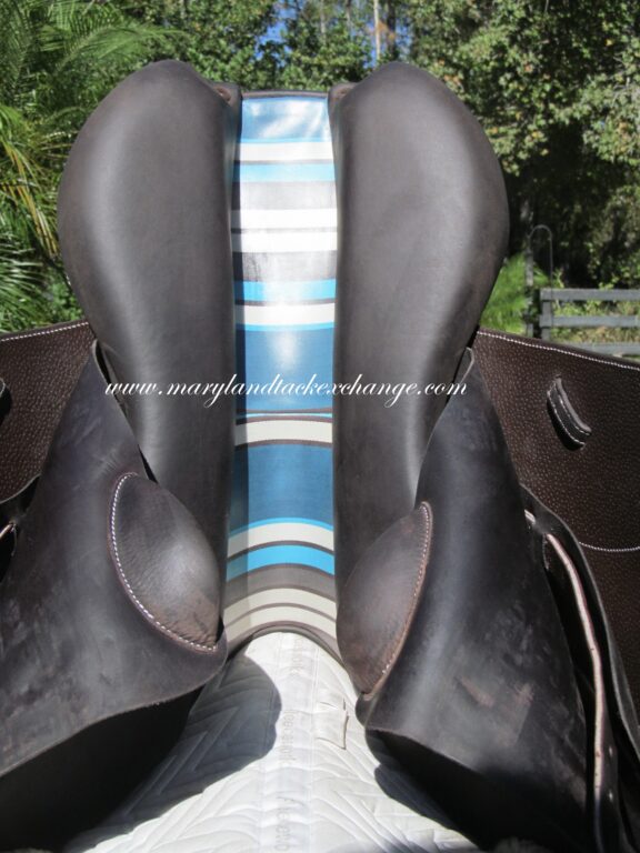 Seat is stamped 17″, flaps measure 13.5″ bar to bottom and 13.5″ across (2A extra forward flaps) the front gullet measures 5″-medium/wide tree.
