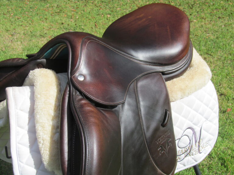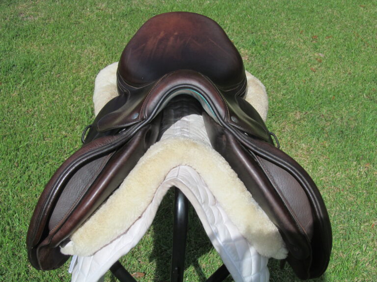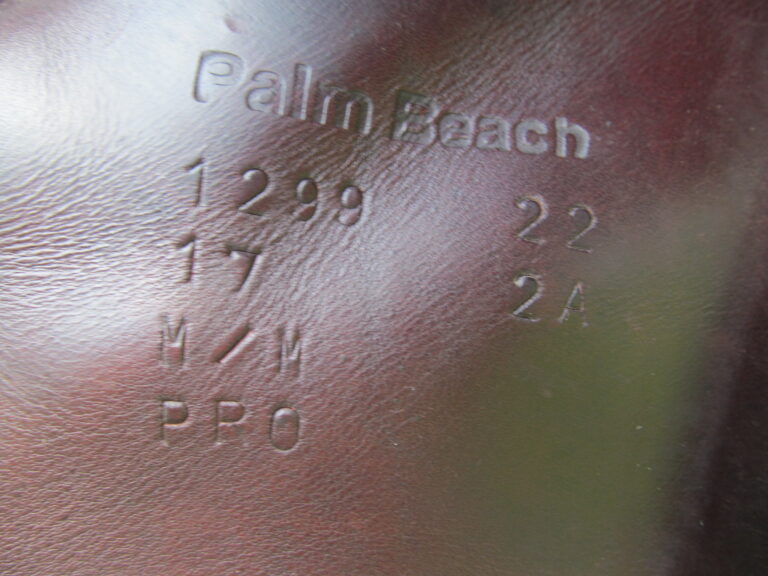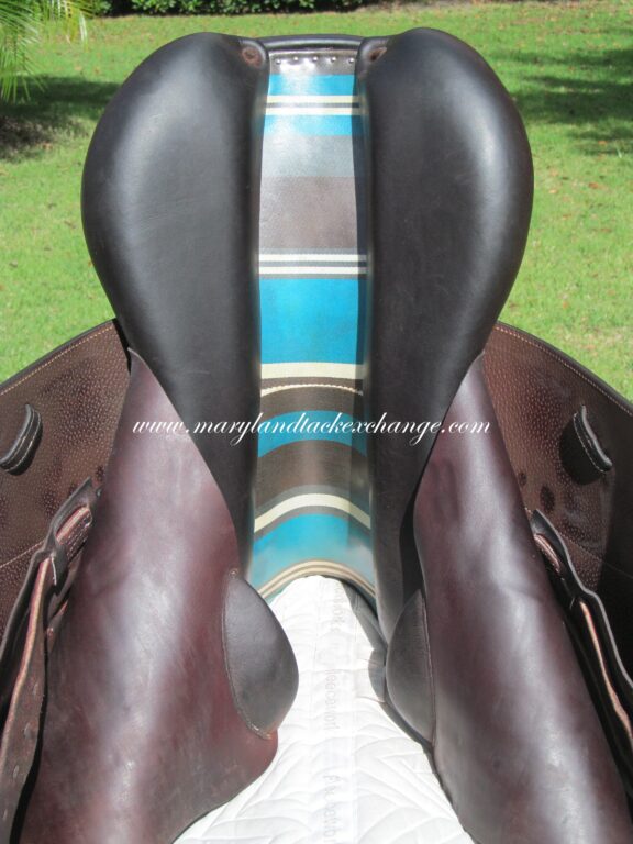 Seat is stamped 17″, flaps measure 13.5″ bar to bottom and 13″ across (2A extra forward flaps) the front gullet measures 5″-medium/wide tree.
