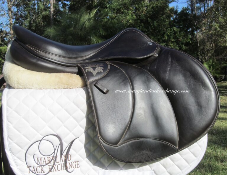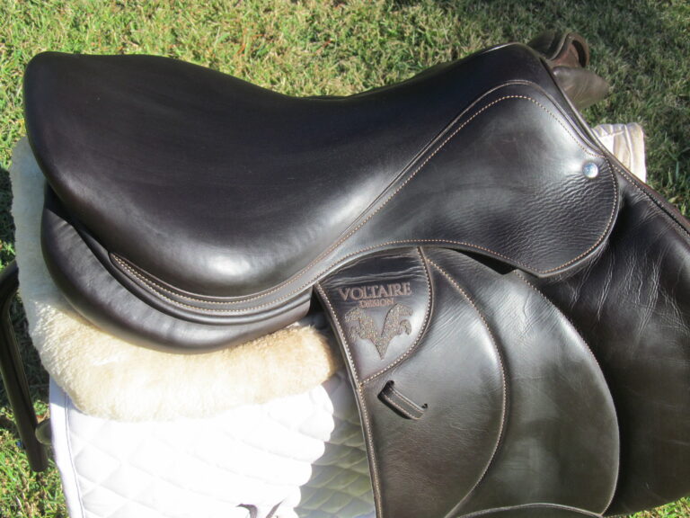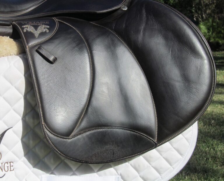 2023 model-Pro Panels. Dark chocolate brown in color with upgraded calfskin leather. Plus the upgraded Swarovski crystals. Saddle is in very nice condition with no tears and no loose stitching. There was never even a name plate put on.The bottom of large right flap shows some boot rubs. The leather is butter soft and very grippy. You will not slip and slide around in this one. Front + back blocks under the flaps. The small leather tag on the bottom shows the current panel info. If you are a tall rider this is a very hard to find seat/flap combo that is really a custom made saddle at a cost of around $8500 with the upgrades.