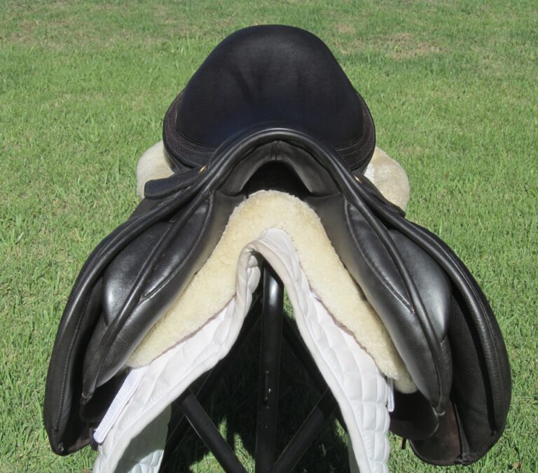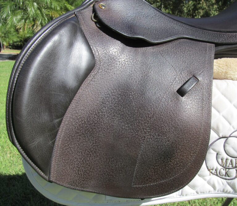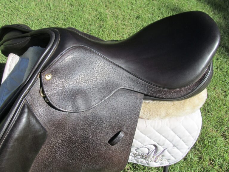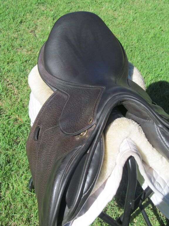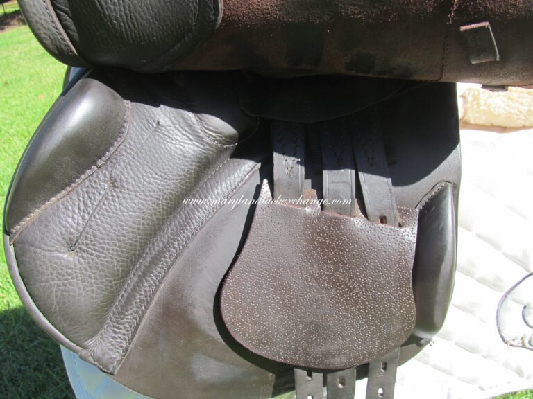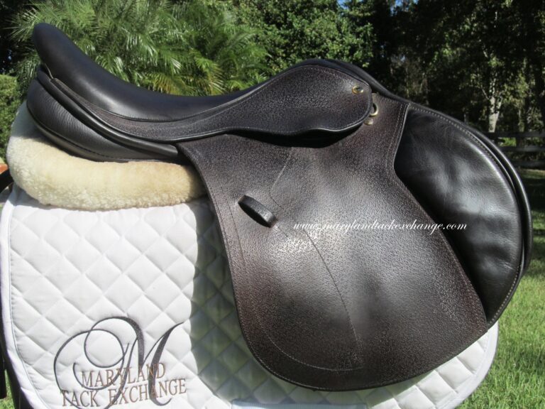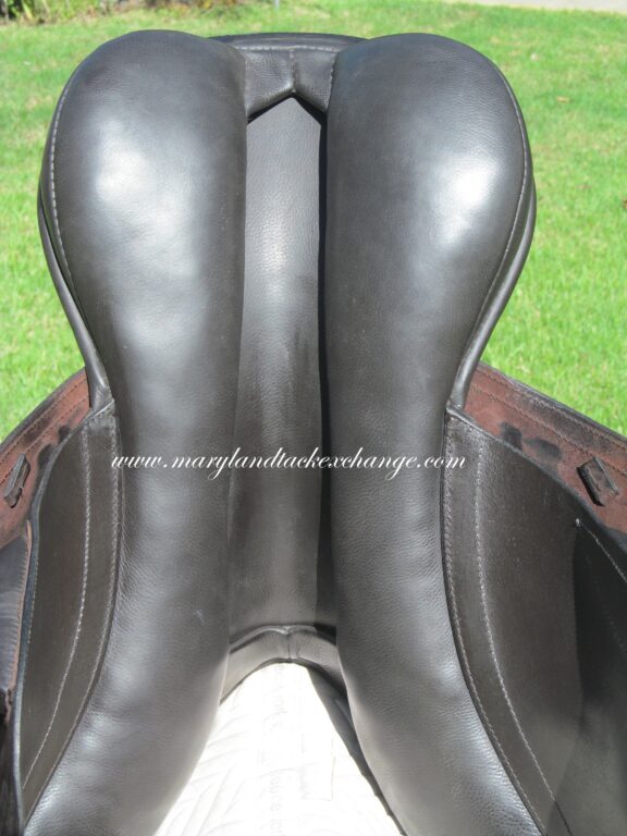 2020 MODEL. Dark chocolate brown in color. Saddle has no tears, no seat seam wear and no loose stitching. Wool flocking so you can make adjustments easy if your horses changes shape a little. Gussetted front shoulder panels that help fill in the hollow area behind the withers. If you have been searching for a higher end wool flocked saddle in this size it is quite rare to find used. Unlikley we will get another in at the tack shop for a while.