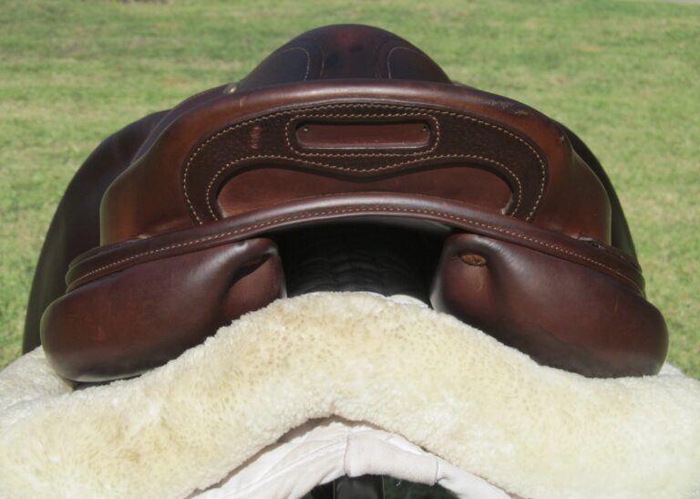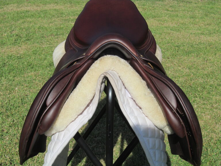 Seat is stamped 18″ flaps measure 13 1/2″ bar to bottom and 14 1/4″ across (5A long/forward flaps) the front gullet measures 4 1/2″- wide tree (this is only measuring 4 1/2 but it is stamped a wide tree and the shape of the pommel is more of a U shape so it will fit horses with minimal wither that typically need those wide trees).