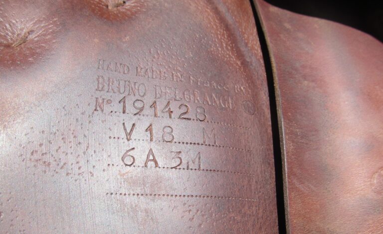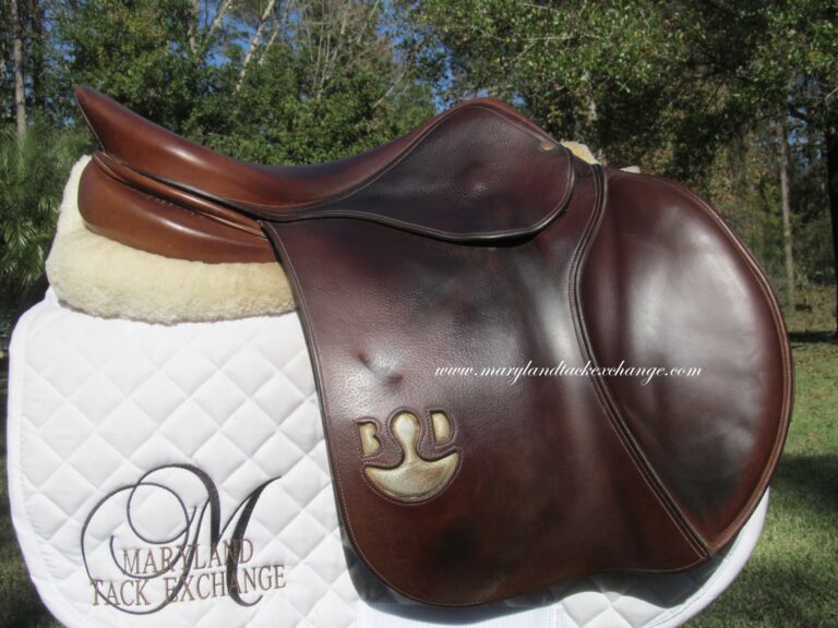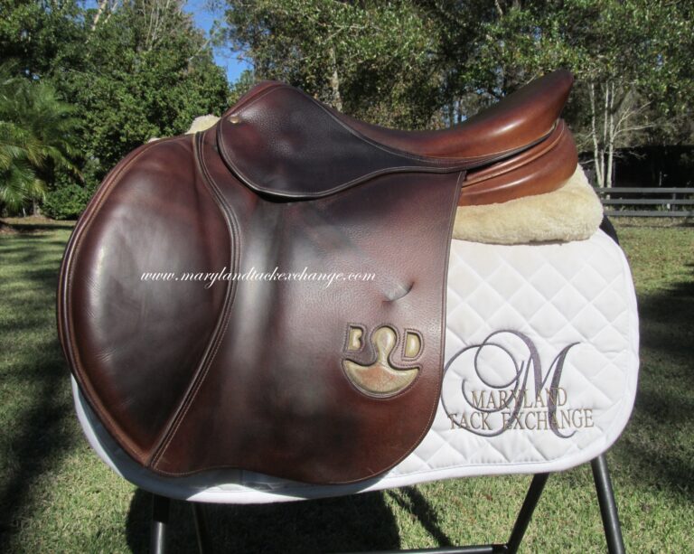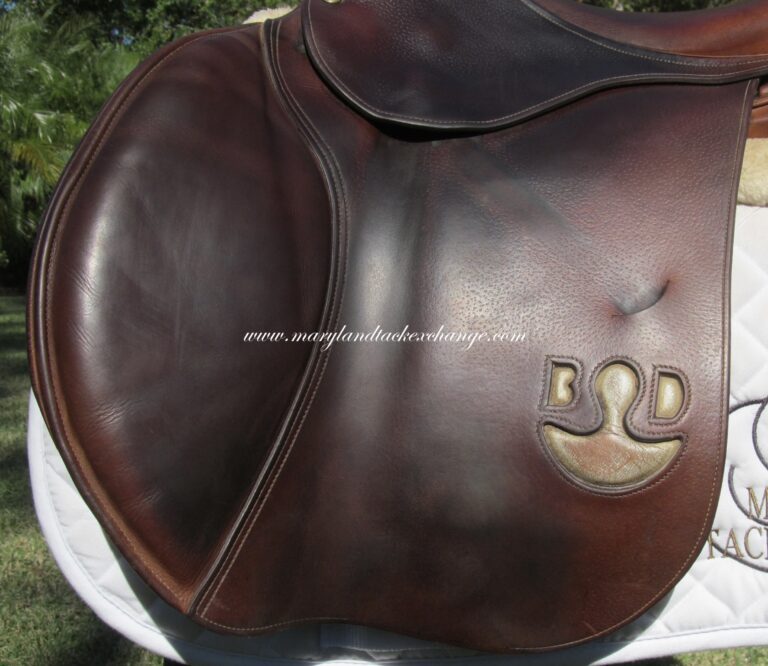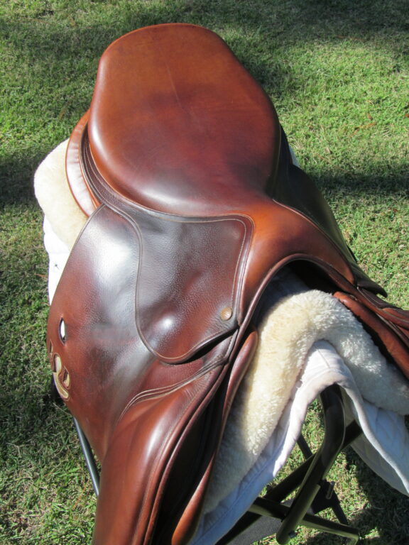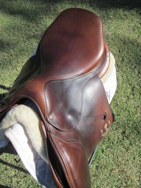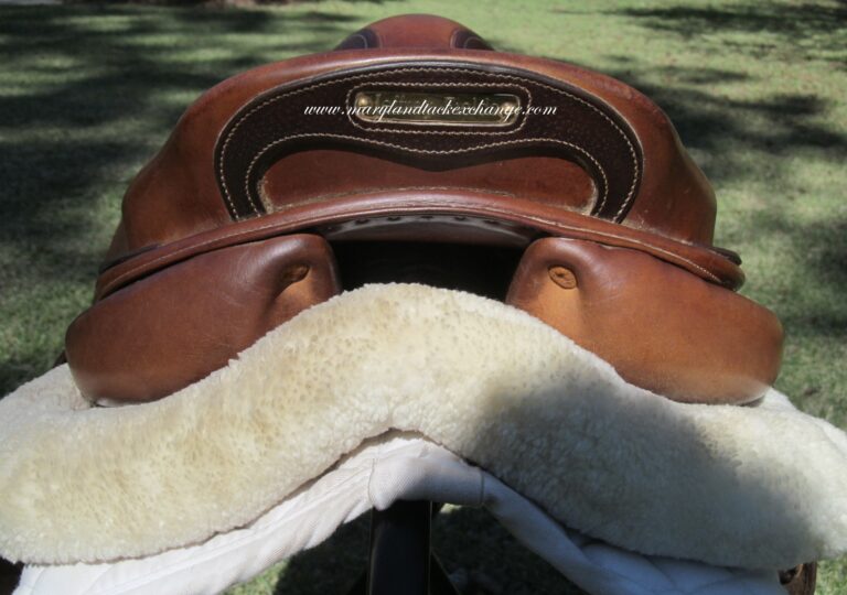 2019 model! New style logo on both sides in silver. The silver is rubbing off a little. Saddle is in nice condition but does show some use. There are no tears and no loose stitching. It does have a name plate that you can cover with you own. The seat does have some light cracking closer to pommel (see picture) and had been discounted due to this. Saddle has both front and back blocks. The outer pads are super soft, thick and squishy and your knees will sink right into them. If you are a tall rider both hip to knee and knee to ankle this could be a really good fit. We rarely get in this seat/flap combo at the tack shop so don’t miss out.