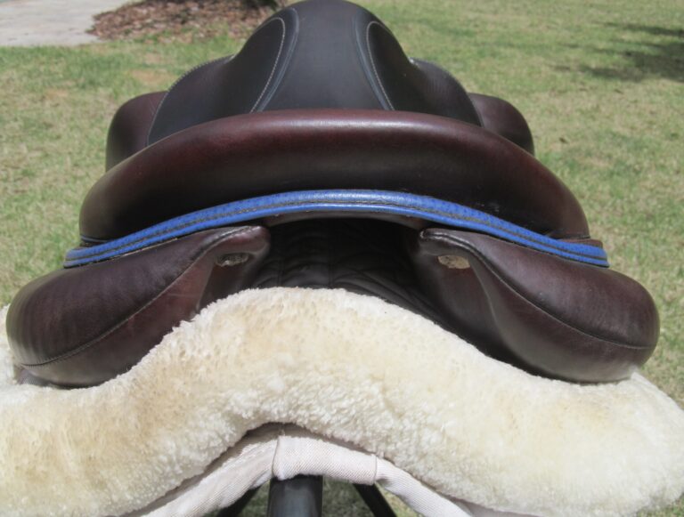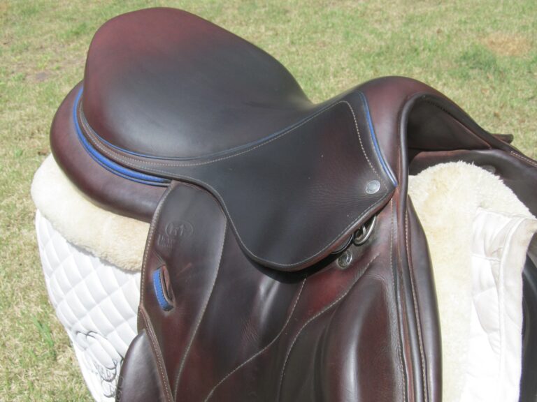 2018 Model! Lovely saddle that has butter soft and grippy leather. This saddle is in nice condition with no seat seam wear, no tears and no loose stitching. Basic use/rubs on flaps from leathers. This never had a name plate put on. Devoucoux logo on the back of both blocks and upgraded colored blue piping along the seat and billet area.