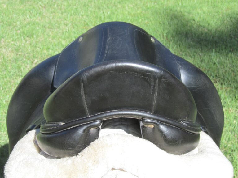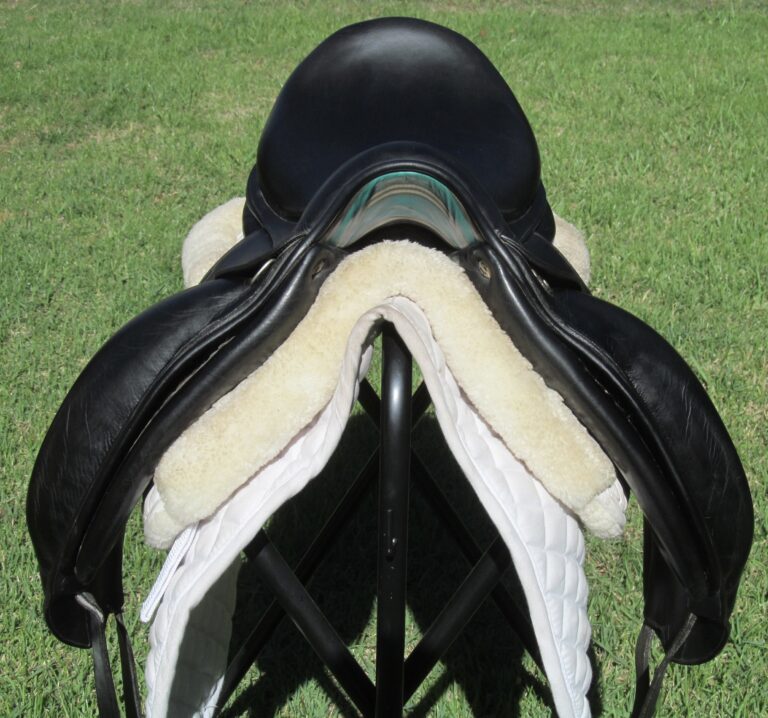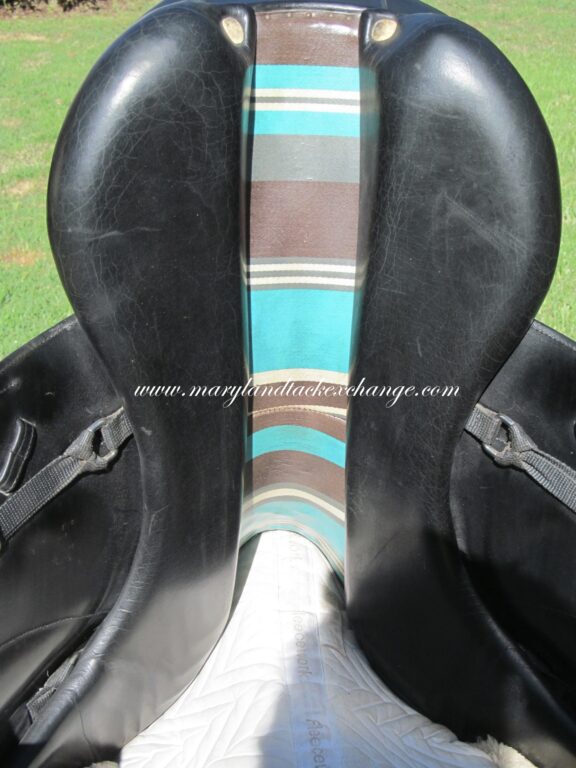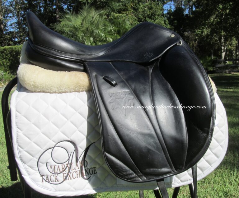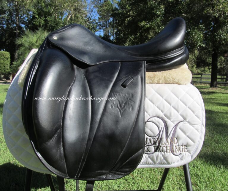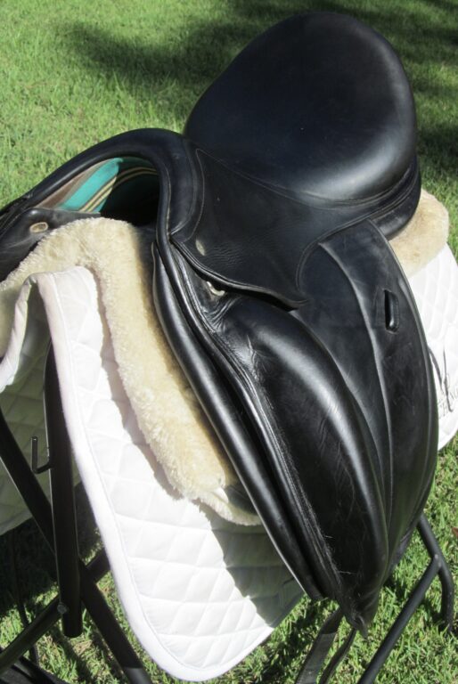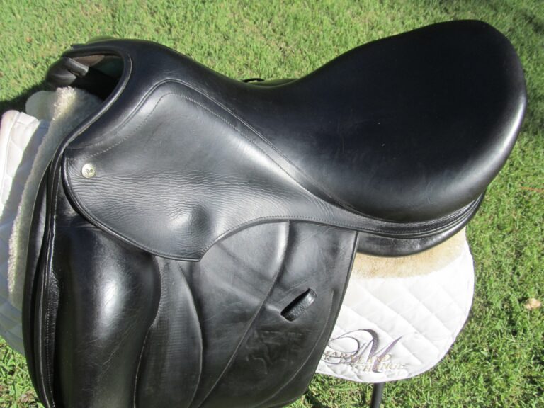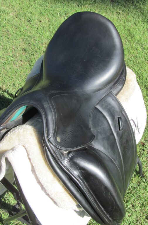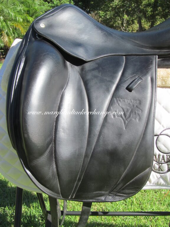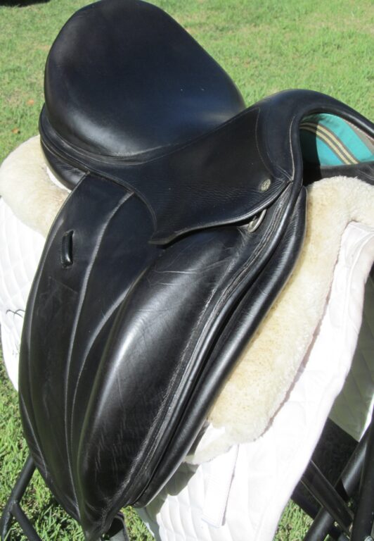 2012 Model. This saddle is monoflap in design so it is a true close contact dressage saddle. Deep seat and large exposed outer blocks really help keep you in place correctly. There are no tears, no loose stitching, no seat seam wear, and no fading. There was never even a name plate put on. Bottom of large flaps are slightly wrinkled at bottom since this has the soft calfskin leather. This has the FIN panels. FIN panels have less filling and are better for wider shoulder horses. Price to sell!