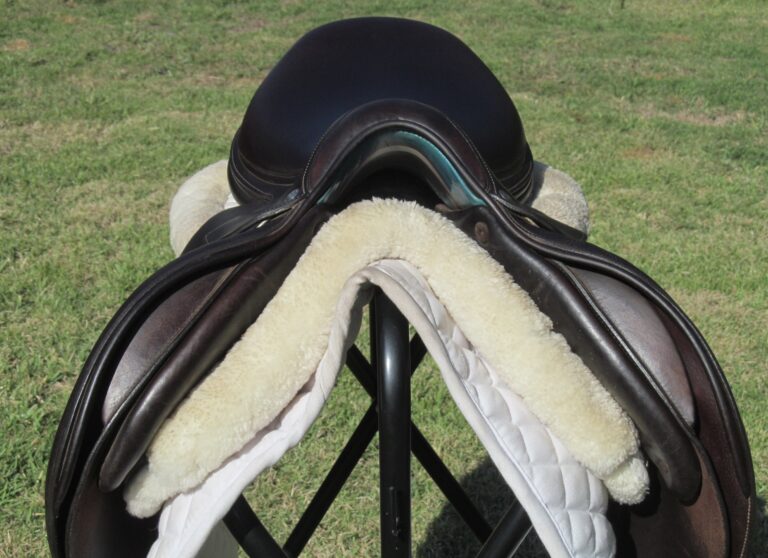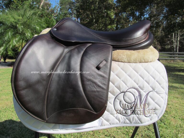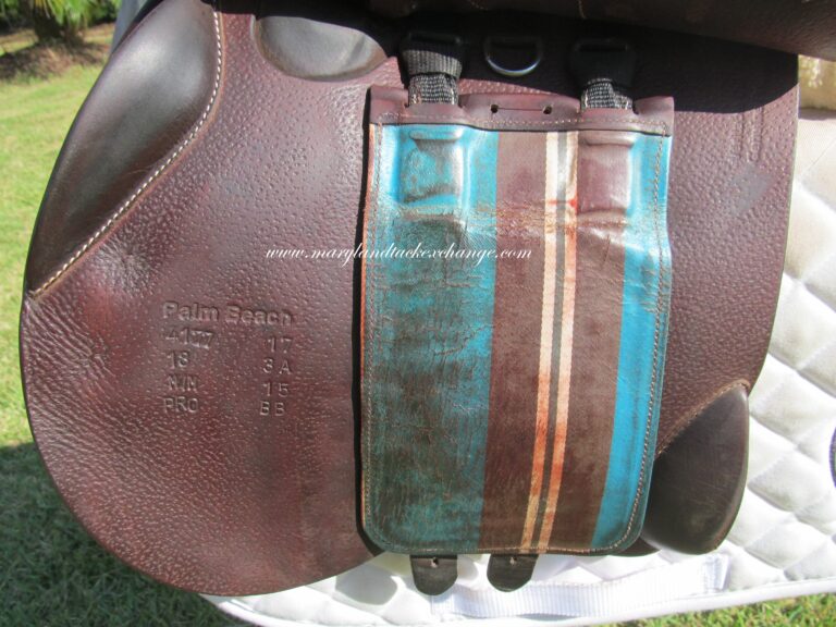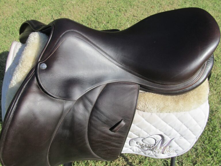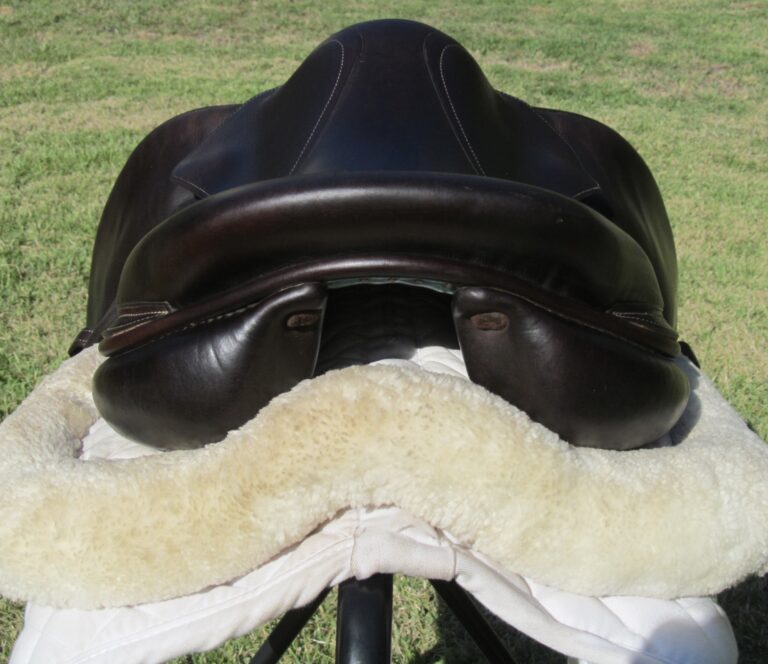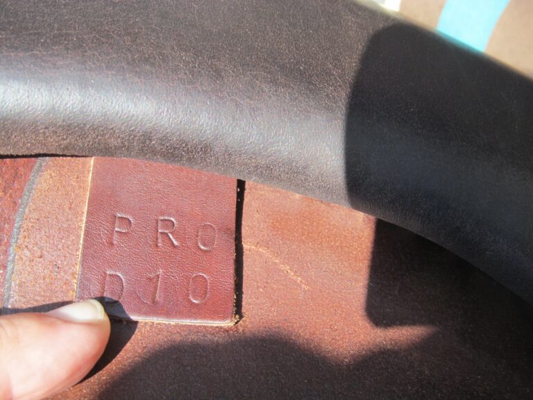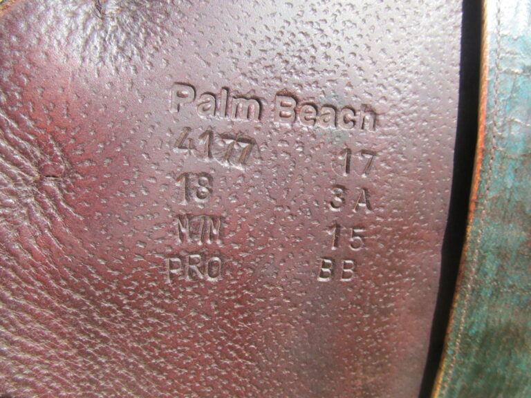 2017 model. Pro Panels, dark chocolate brown in color with upgraded calfskin leather. Saddle is in nice condition with no tears and no loose stitching. There was never even a name plate added. Bottom of large flaps show light boot rubs. The leather is butter soft and very grippy. You will not slip and slide around in this one. Front + back blocks under the flaps. The small leather tag on the bottom shows the current panel info.