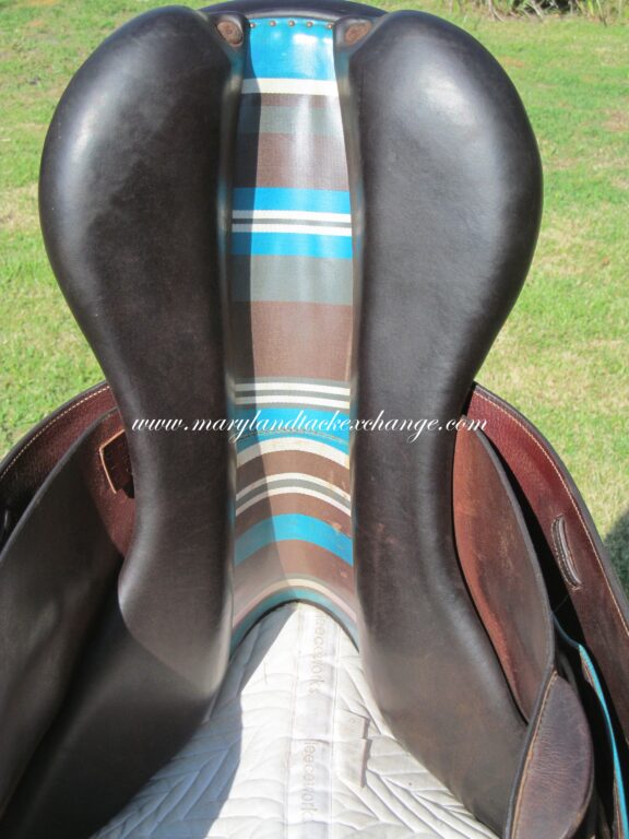 Seat is stamped 18″, flaps measure 14″ bar to bottom and 13 1/4″ across (3A extra forward flaps) the front gullet measures 4 1/2″-medium tree.