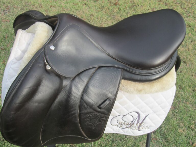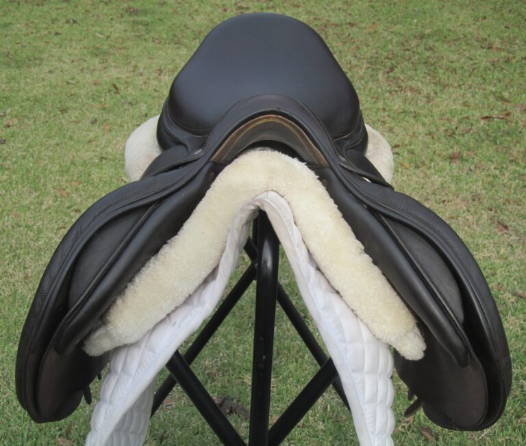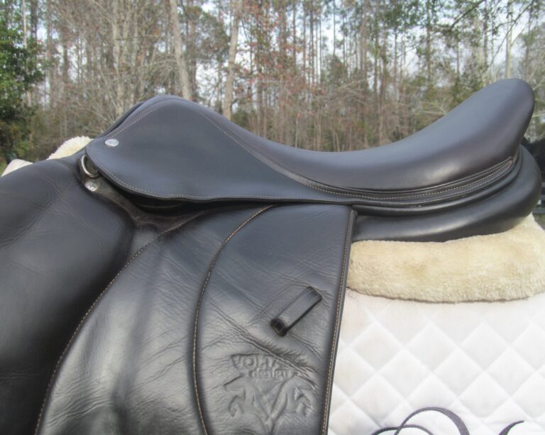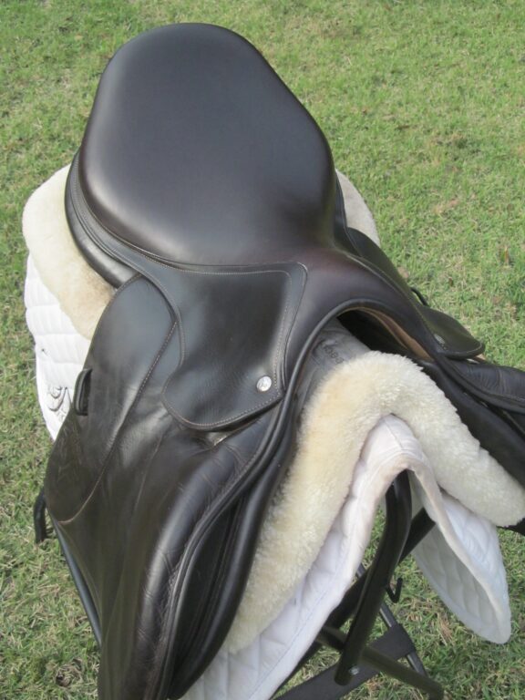 2019 model. Dark chocolate brown with the upgraded buffalo leather. You will not slip and slide around in this saddle. The leather has been well conditioned and is soft. Outer pads are nice and squishy for your knees. Pro panels. Front + back blocks under the flaps. Very back of small block is rubbed through under the flaps. The Stuttgart model has the deeper seat. Great for a tall rider long hip to knee.