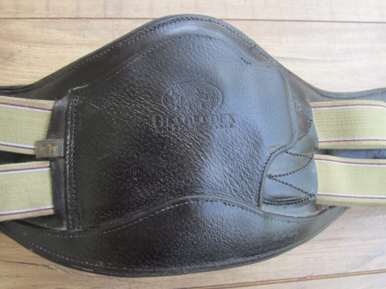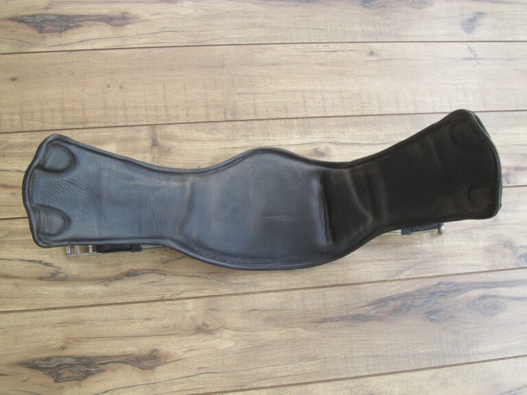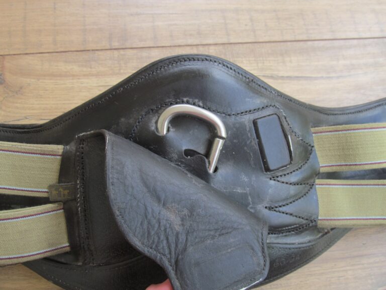 Nice used 24″ Devoucoux black dressage girth. The item is used so you can expect some basic use and hairs in edges but there is no cracking or loose stitching.The elastic is in quite nice condition as well. This has the new feature with the snap in middle being held by a magnet so hooking/unhooking training equipment is easy. Retails new over $400.