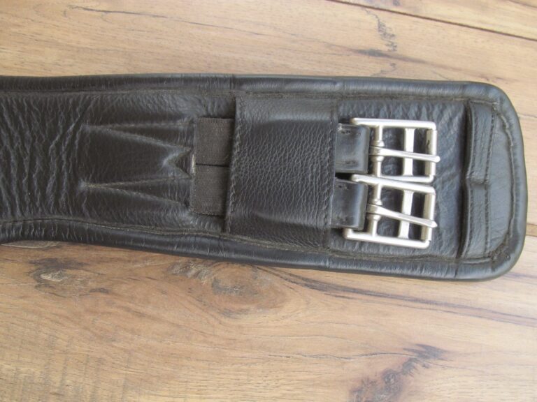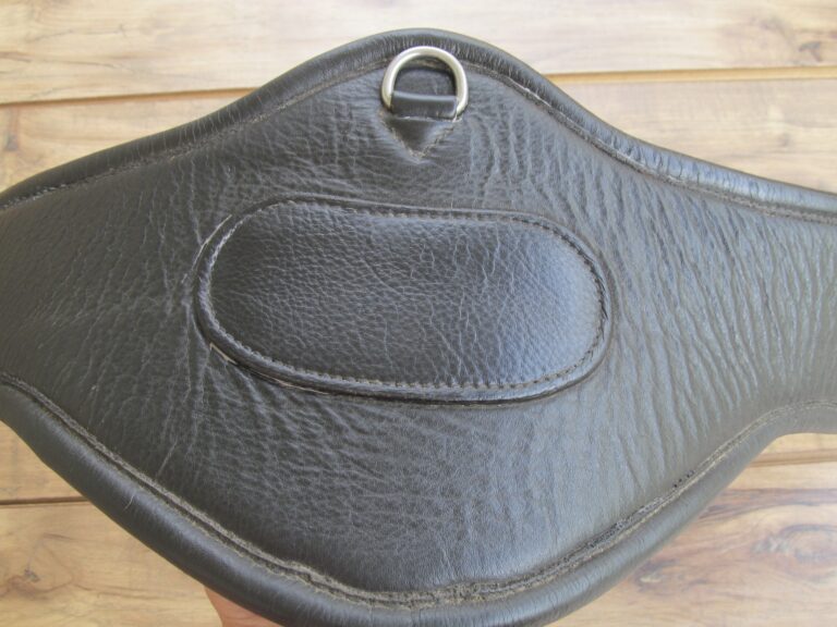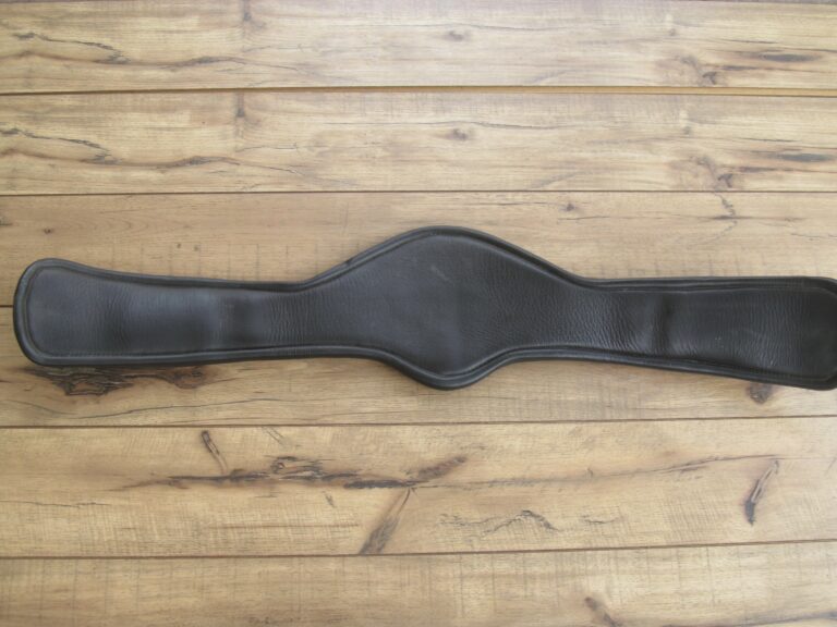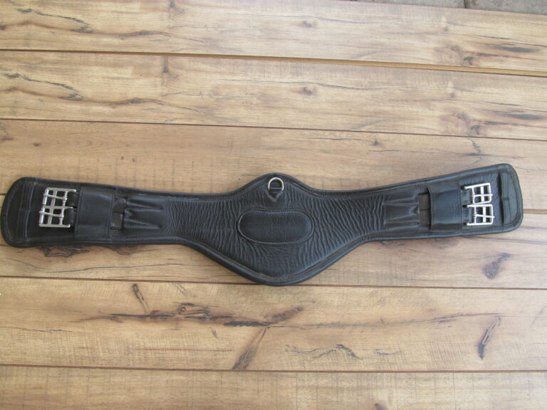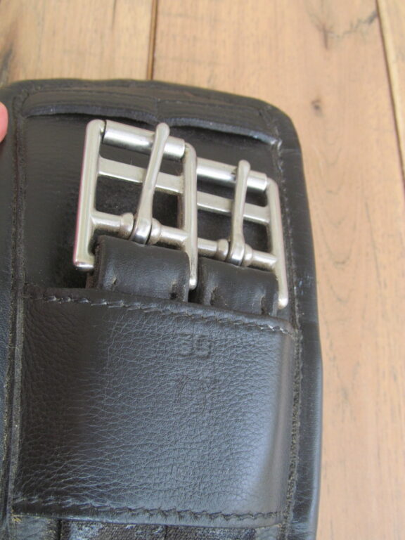 Lovely 30″ Schleese short black dressage girth with a wider middle area to distribute pressure. This girth is in very nice condition with no tears and no fading. It is used so you can expect some dirt on the elastic and some horse hairs in the edges. The girth is so soft you can just about roll it up so your horse will thank you for this nice soft piece of equipment.