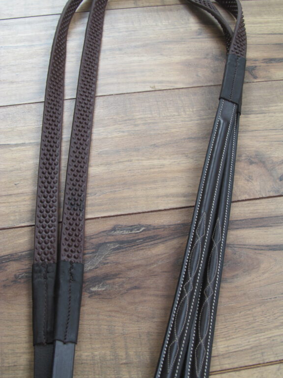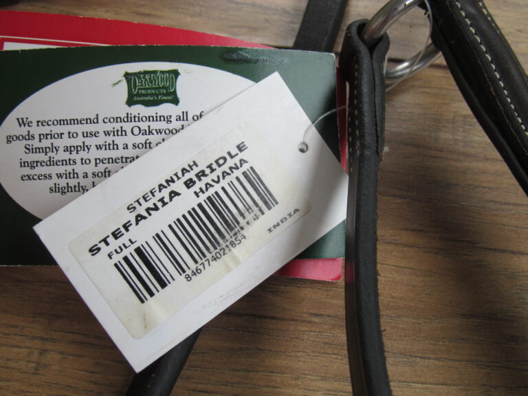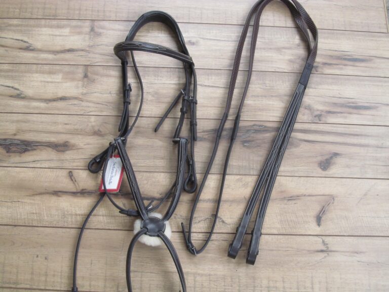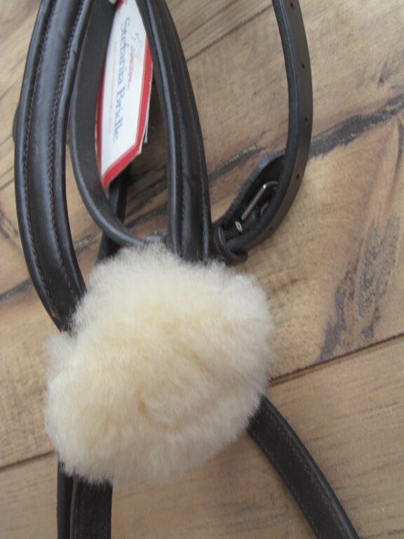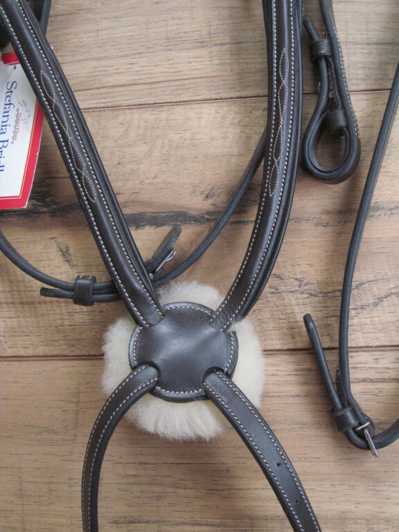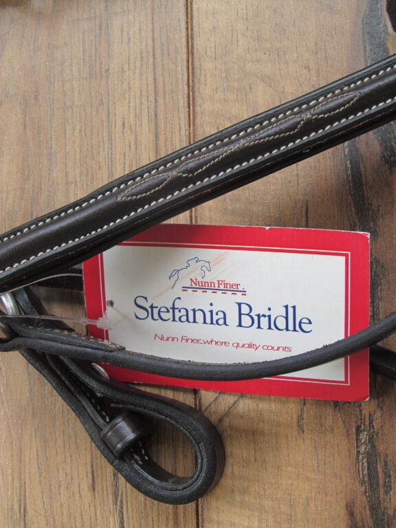 BRAND NEW WITH TAGS, Stefania figure 8 bridle with matching rubber reins. Dark brown in color. Round Raised and fancy stitched with sheepskin on noseband. Lovely bridle with an affordable price tag.